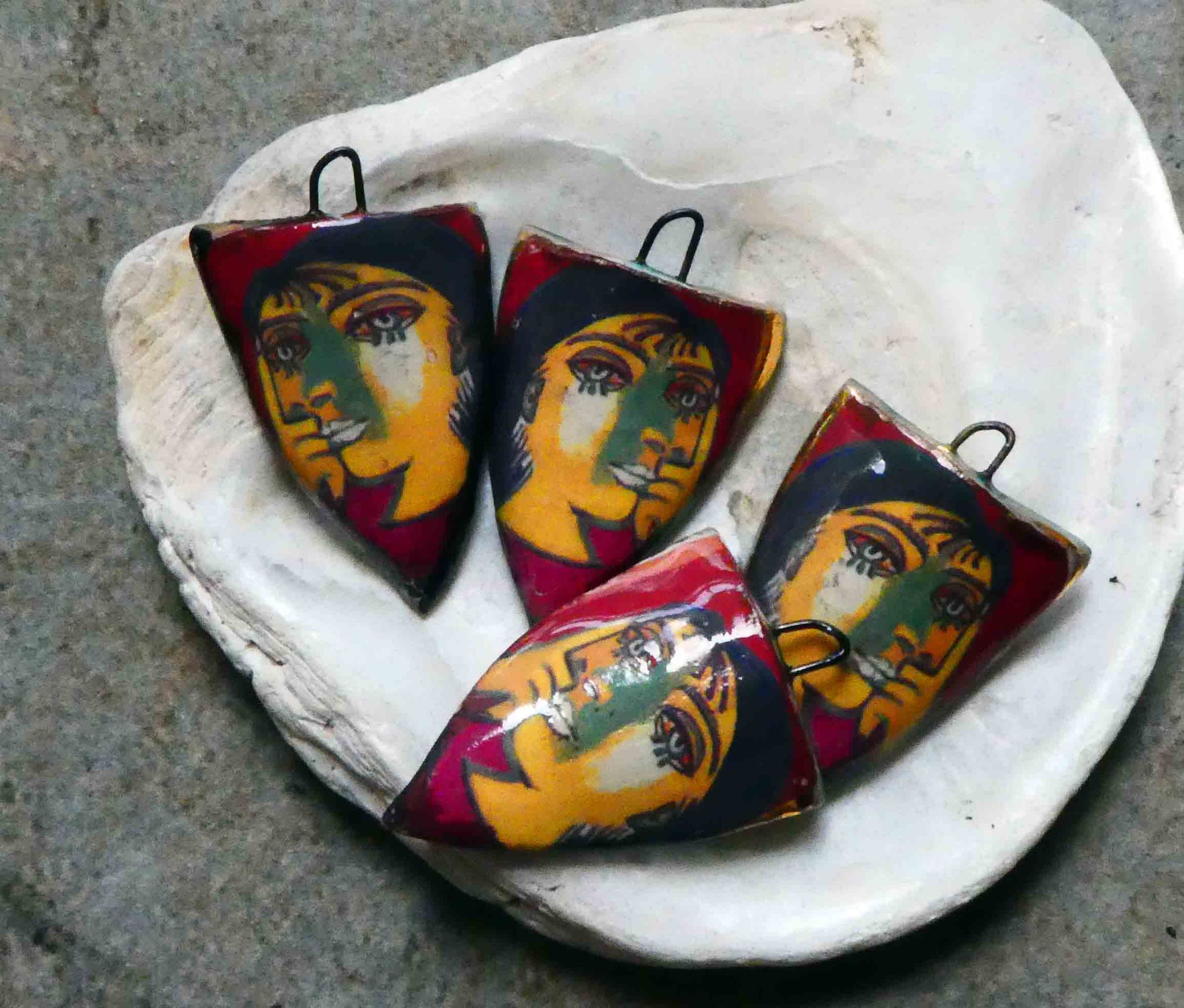 A pair of lightweight shield drops. Hand formed in Earthstone and high fired. Then fired with glossy glaze and my own Bronze clay. Applied with Picasso ceramic decals and Platinum Lustre and fired again.