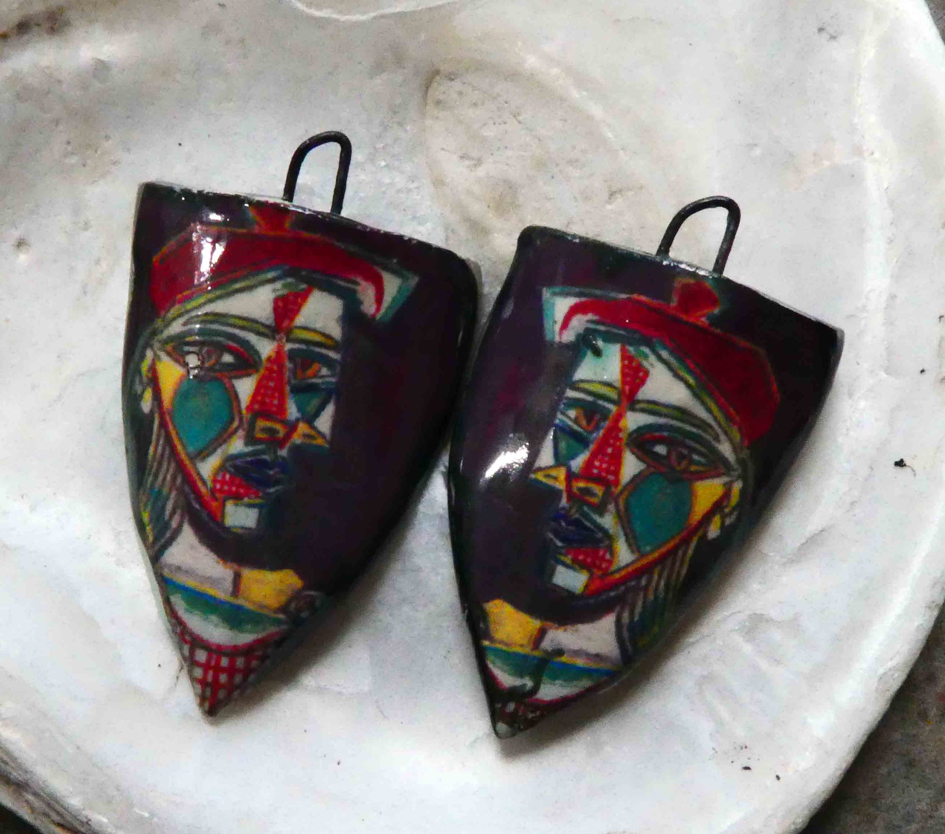 A pair of lightweight shield drops. Hand formed in Earthstone and high fired. Then fired with glossy glaze and my own Bronze clay. Applied with Picasso ceramic decals and Platinum Lustre and fired again.