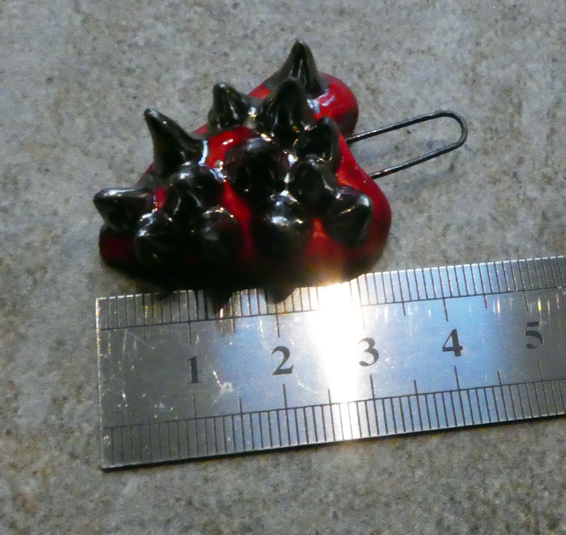 Hand formed in Earthstone and high fired. Then fired again with Black and Red glaze. Fired once more with Platinum lustre.