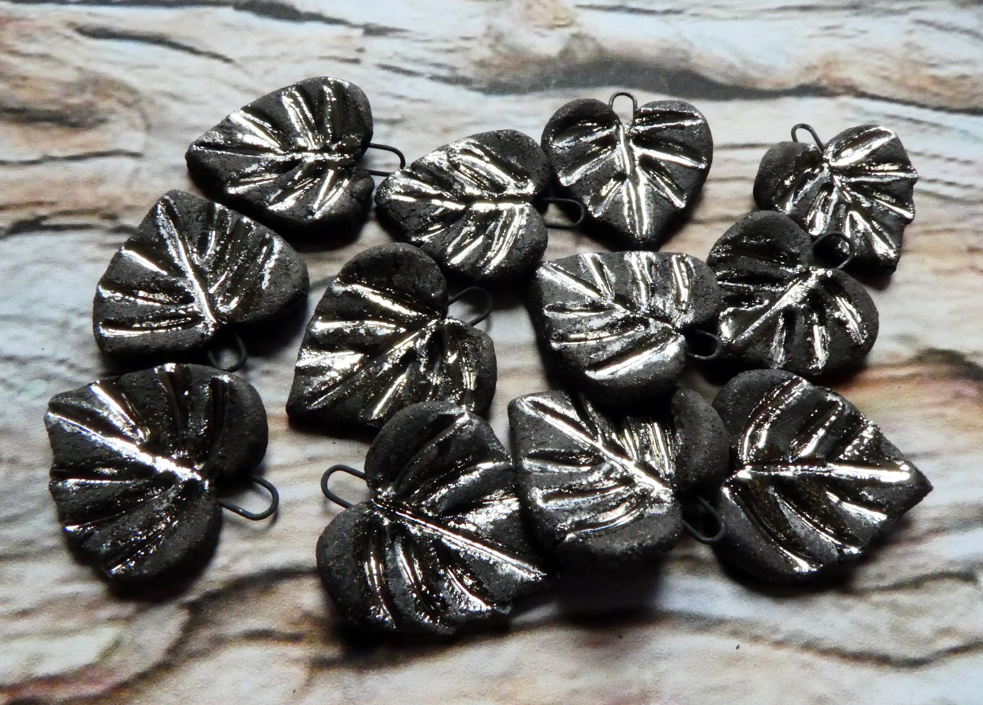 Ceramic Black and Platinum Heart Shaped Leaf Charms
