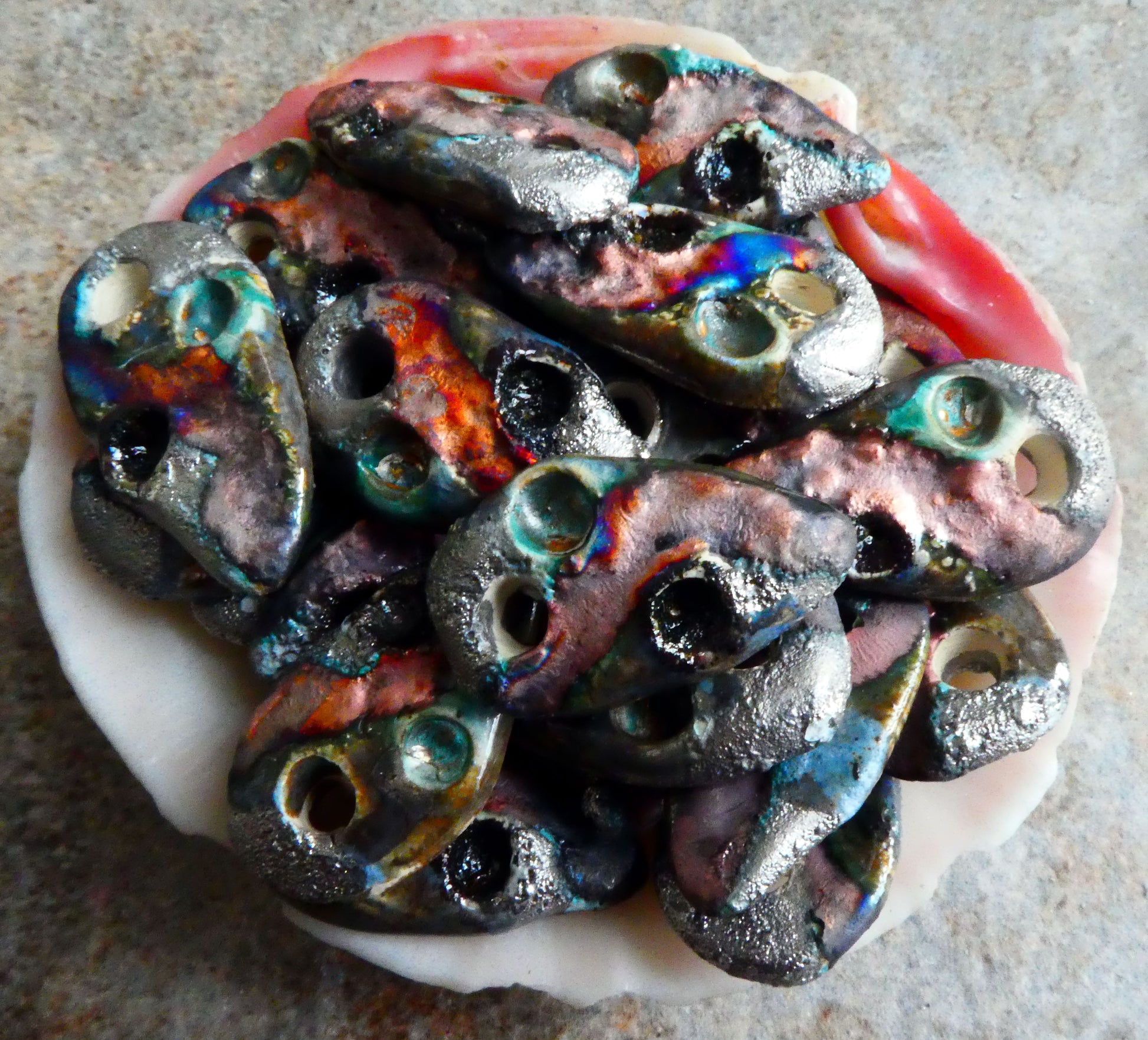 A pair of rock shard earring charms. Hand formed in Earthstone, textured with stone,and dimpled.High fired.Applied with my own Bronze clay, Grey Feather and Snowfall glaze. The dimpled areas, I filled with Spangles and Sterling Silver, then fired again. Then I applied the Snowfall areas with Platinum Lustre, and fired once again. Then scorched on the bronzy areas to a bright coppery finish. They're all different sizes, but roughly 30mms, and very lightweight. ©ScorchedEarthDesigns