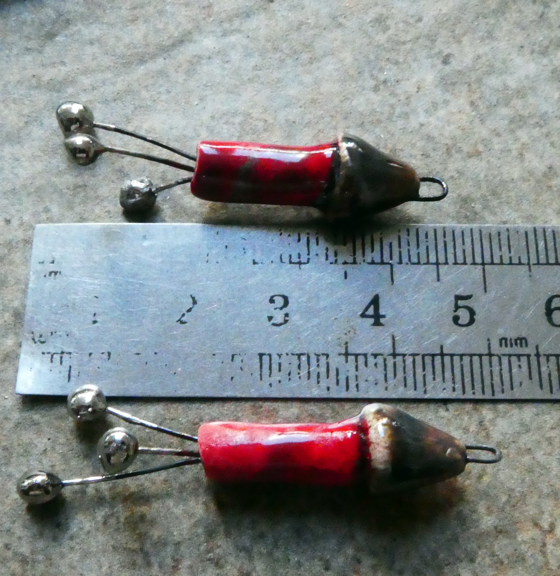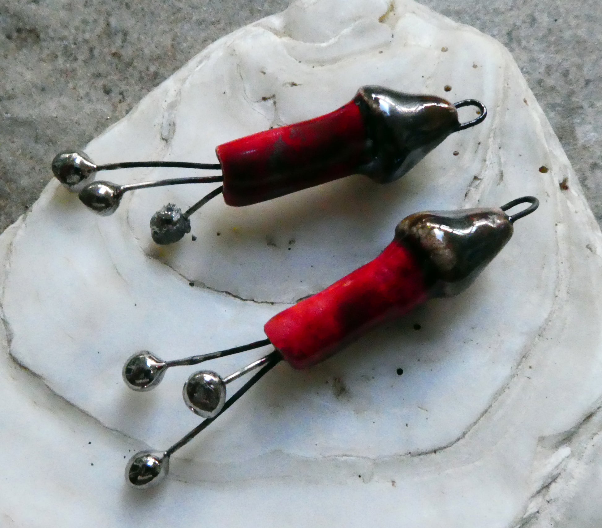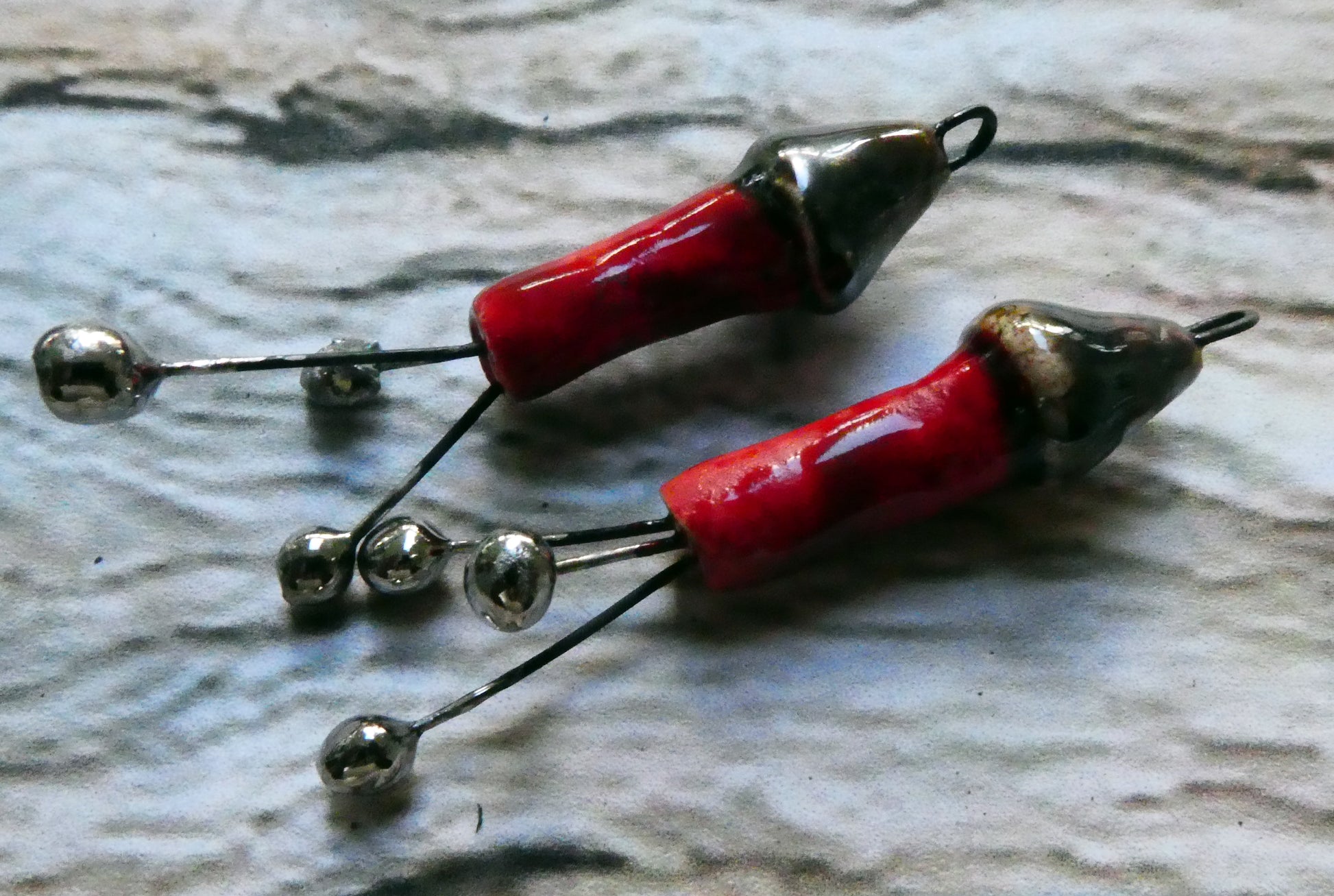 Hand formed in Earthstone and high fired. Then fired again with Gloss, Red and Metallic Gold glaze. Fired again with Platinum Lustre.