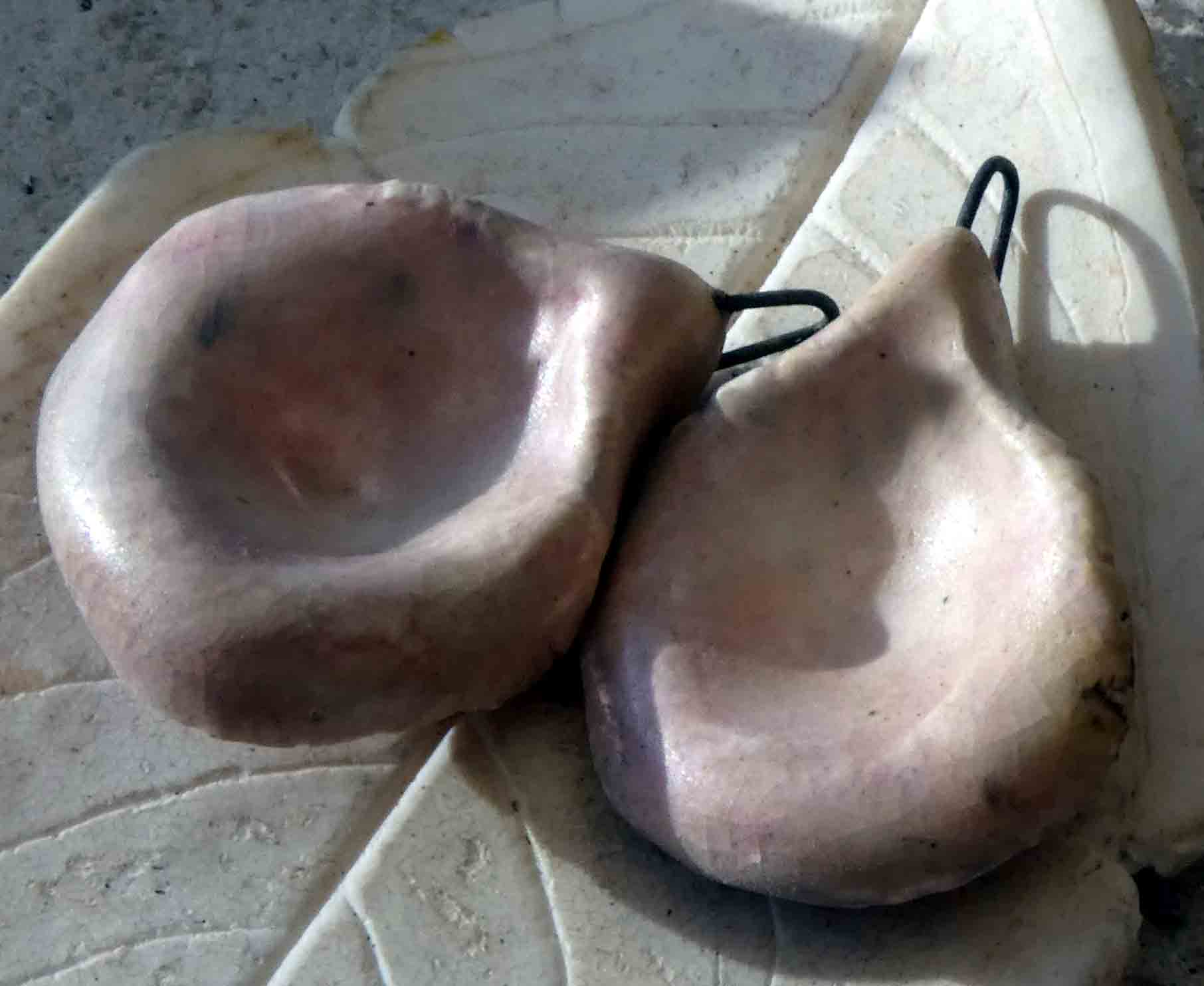 Hand formed in Earthstone, and high fired. Then fired again with Orchid glaze. Applied with Mother of Pear Lustre, and fired again. They've resulted in a satiny finish.