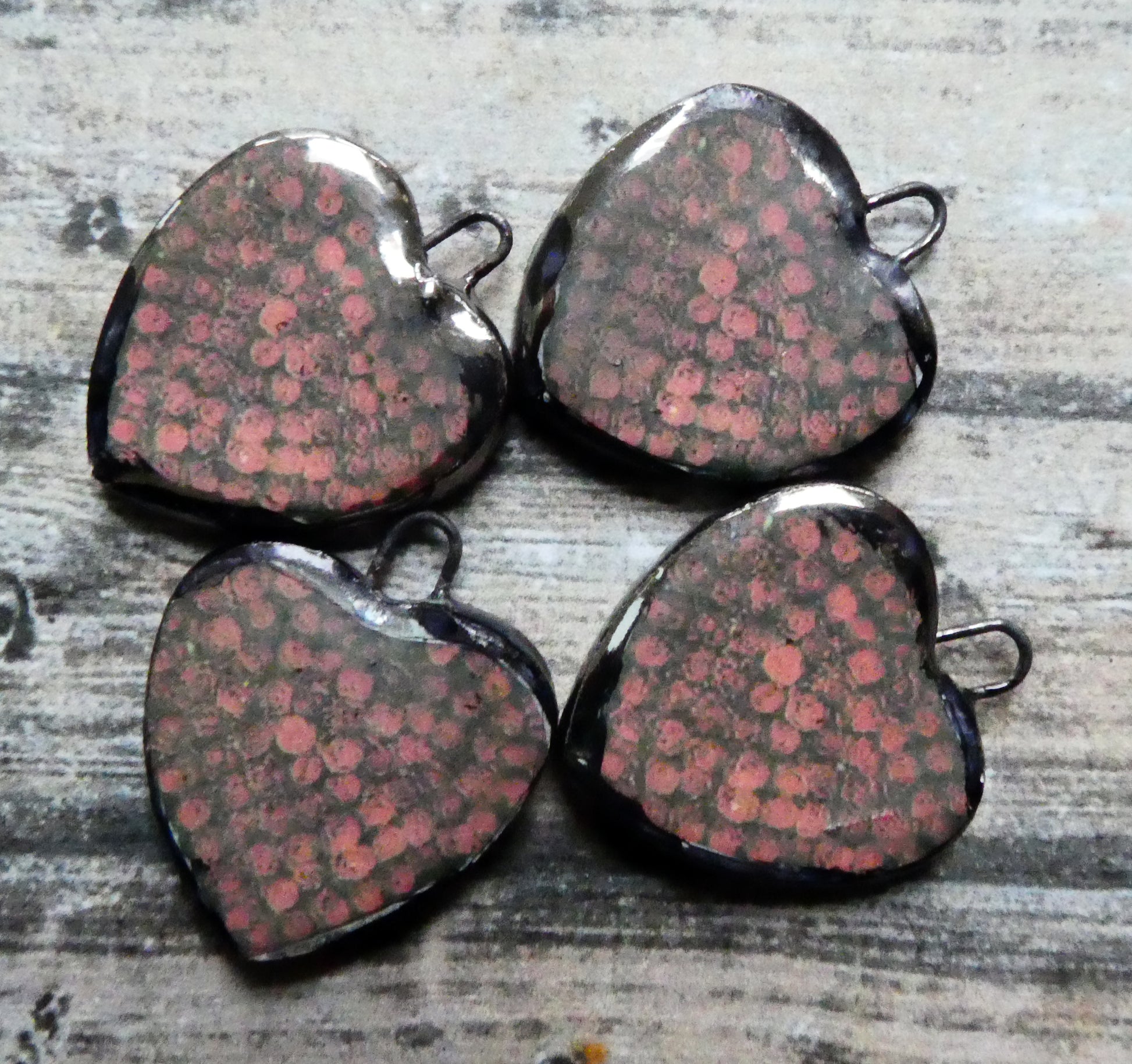 Hand formed in Earthstone and high fired. Then fired again with bronze clay and gloss glaze. Applied with decals and fired again. Scorched on the backs to a rainbow finish.