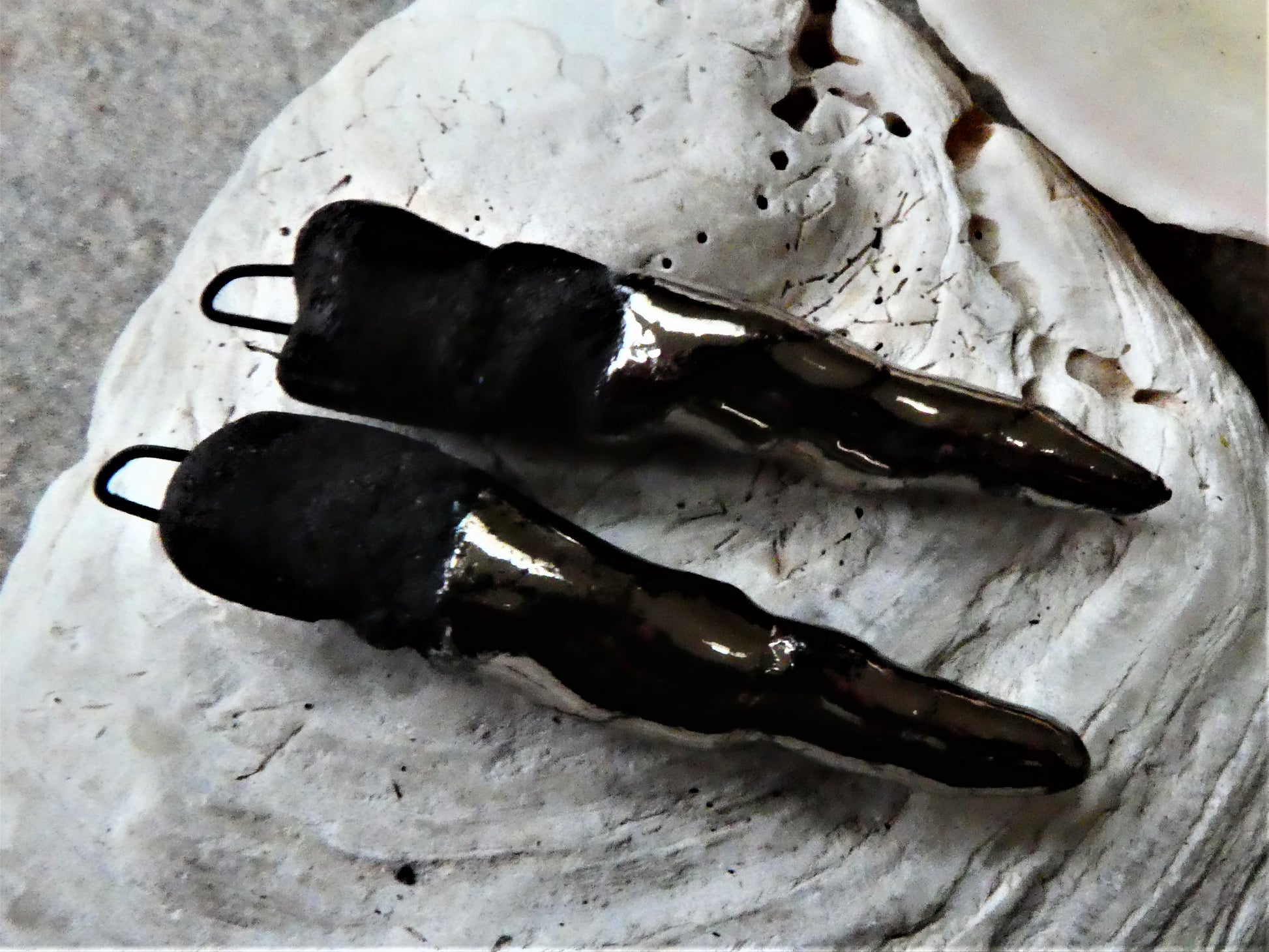Hand formed in smooth black stoneware and high fired. Then fired again with gloss glaze. Applied with Platinum Lustre and fired once more. 45mms and lightweight.
