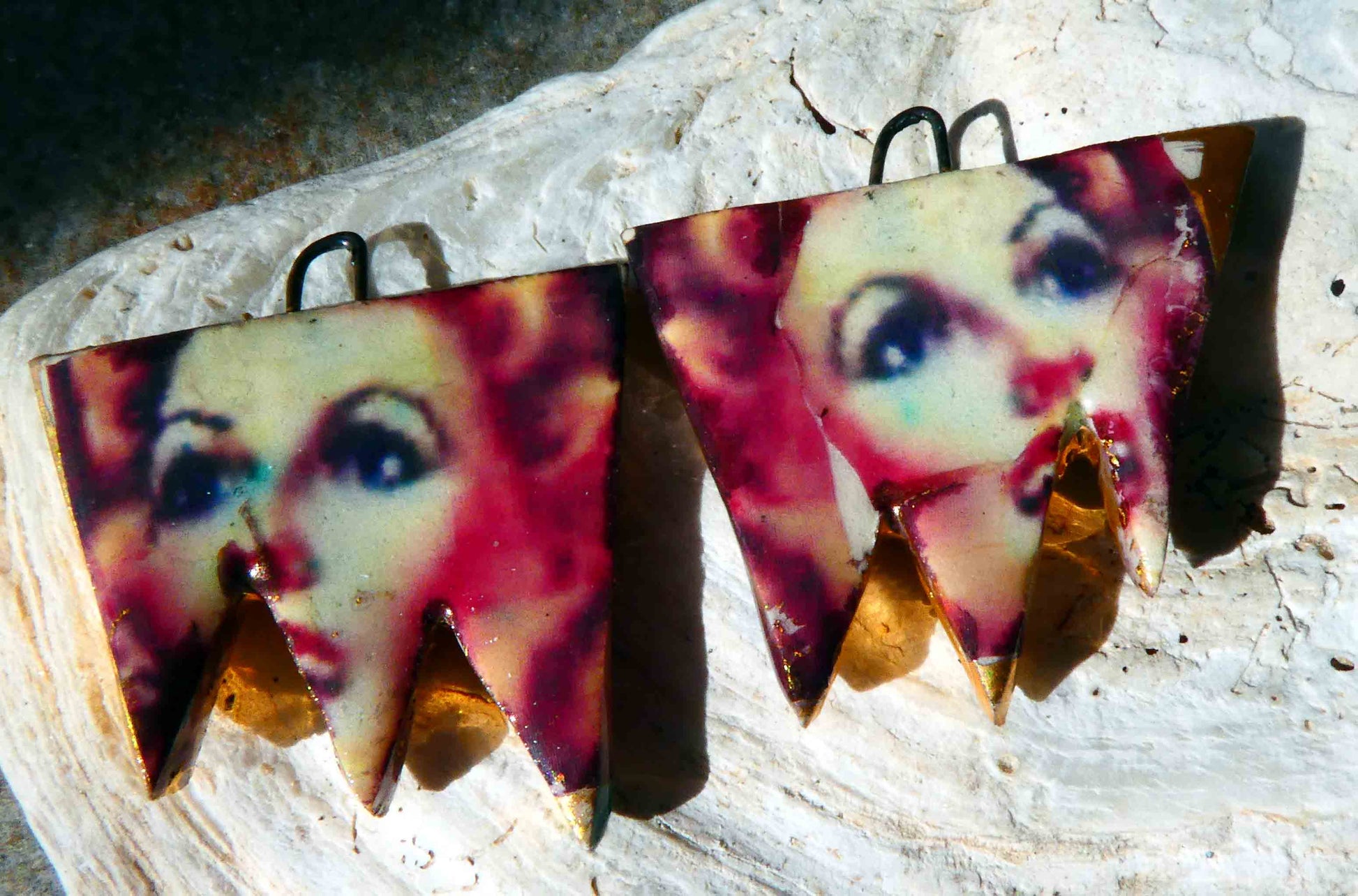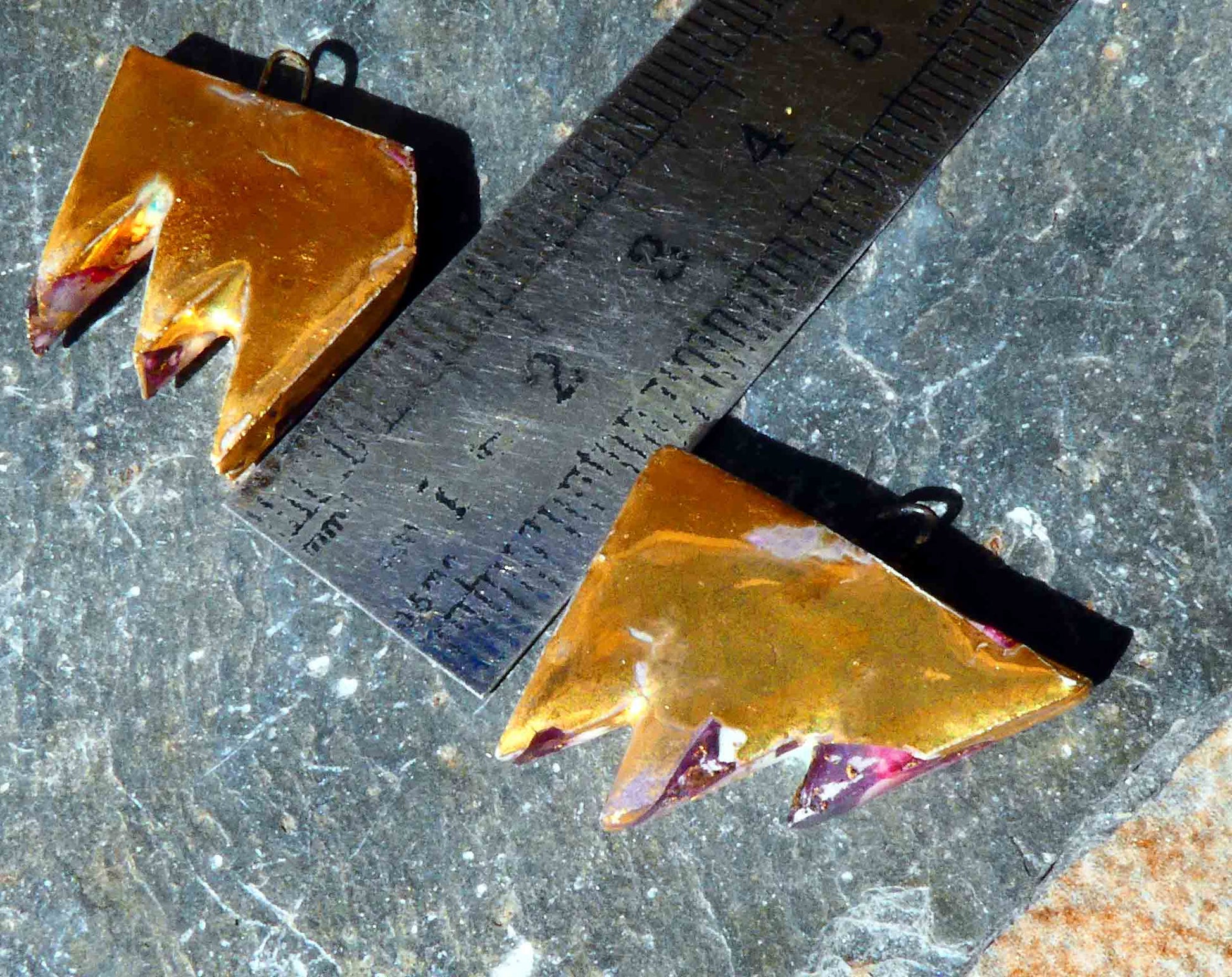 A pair of lightweight droppers. Hand formed, asymmetric, torn curtain shapes in Earthstone. High fired, then fired again with glossy glaze. Then applied with Screamer decals and fired again with Gold lustre. 25mms, and very lightweight. ©ScorchedEarthDesigns