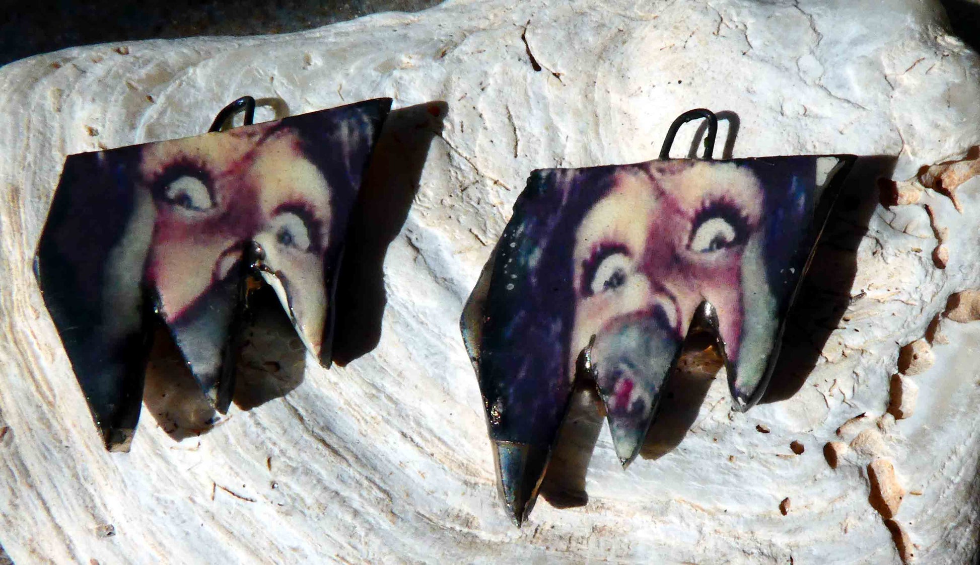 A pair of lightweight droppers. Hand formed, asymmetric, torn curtain shapes in Earthstone. High fired, then fired again with glossy glaze. Then applied with Screamer decals and fired again with Platinum lustre. 25mms, and very lightweight. ©ScorchedEarthDesigns