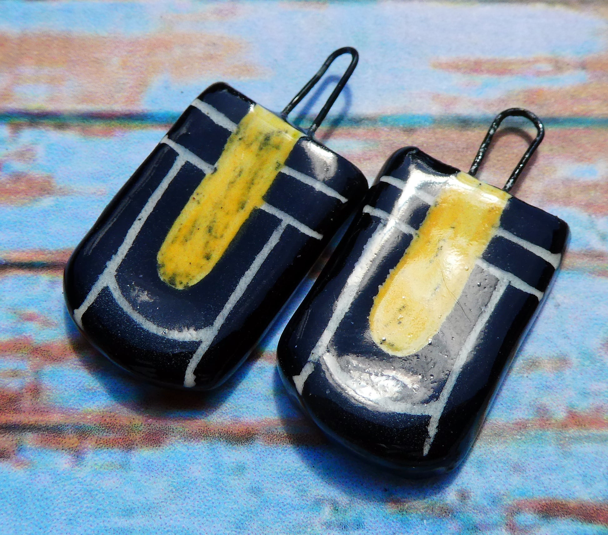 Hand formed in Earthstone and high fired with matte black glaze into which the design has been etched. Applied with Saffron and Gloss glaze and fired again.