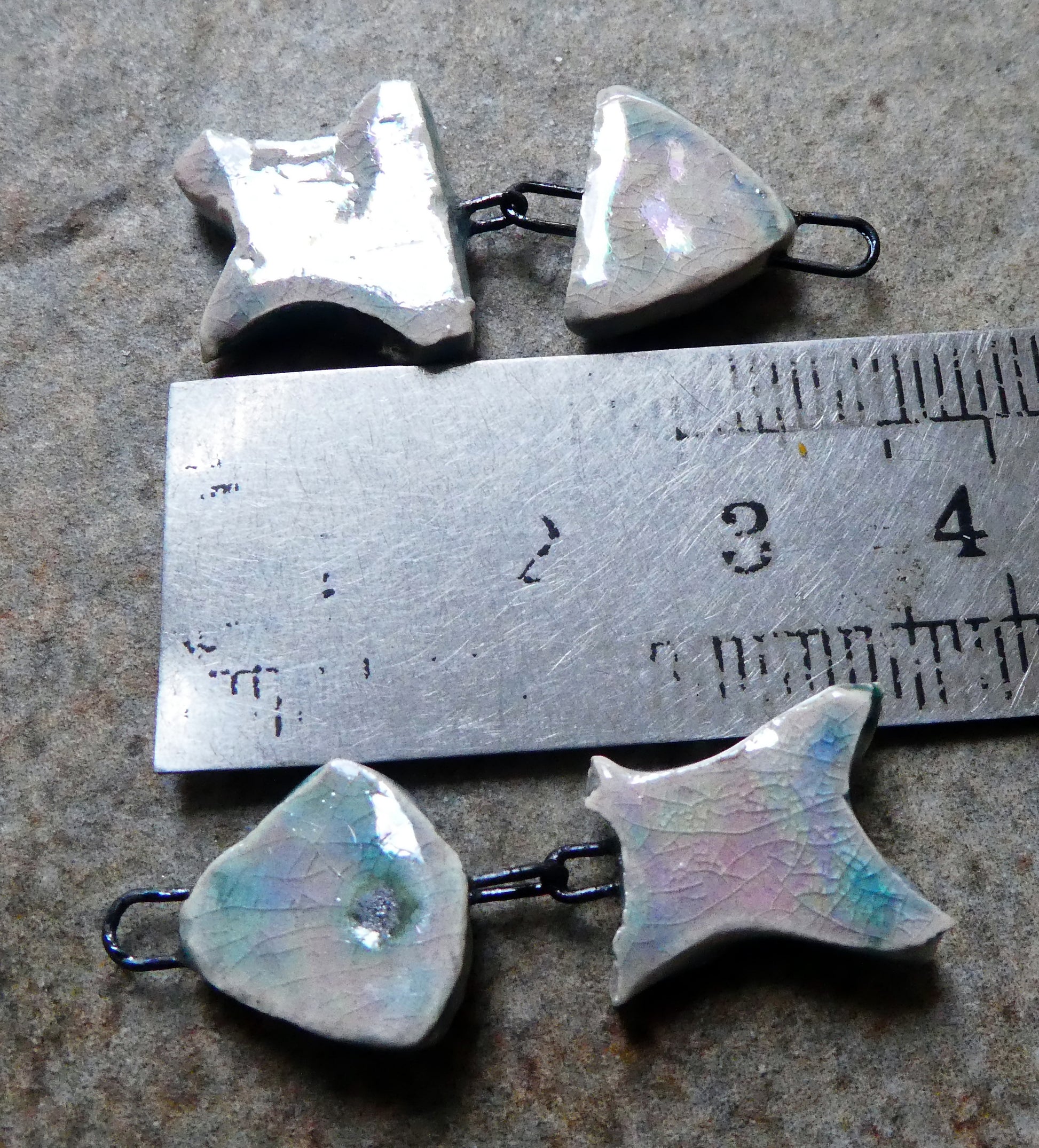 Hand formed in Earthstone and textured. High fired, then fired again with Bronze clay and Orchid glaze. Applied with Mother of Pearl lustre, and fired once more.