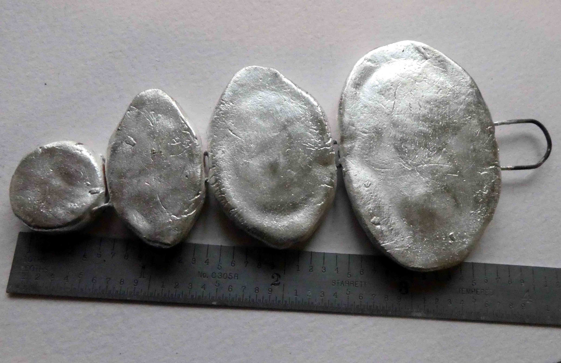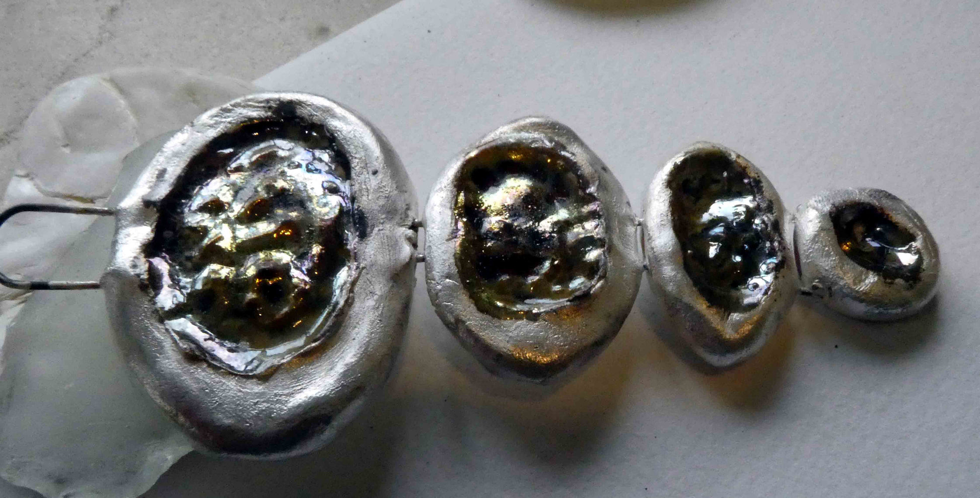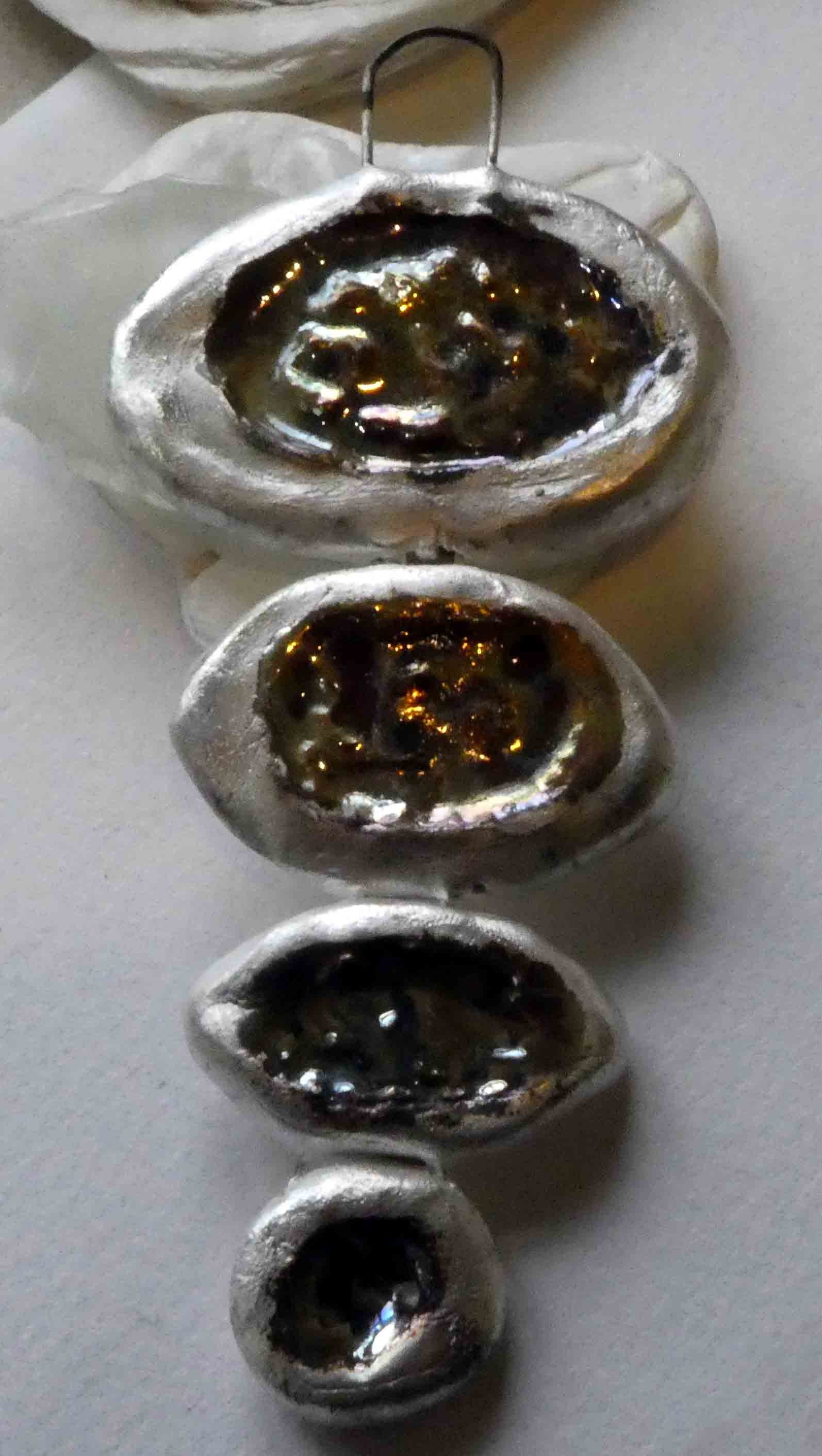 A pendant of shimmering pools. Hand sculpted pendant, in Earthstone. Four pools, wired together internally, and high fired. Then applied with layers of .999 Fine Silver, and fired again. I then filled the pools with different enamels, and overfired it. As a result, the enamels have taken on a lustrous goldy irridescence. ©ScorchedEarthDesigns