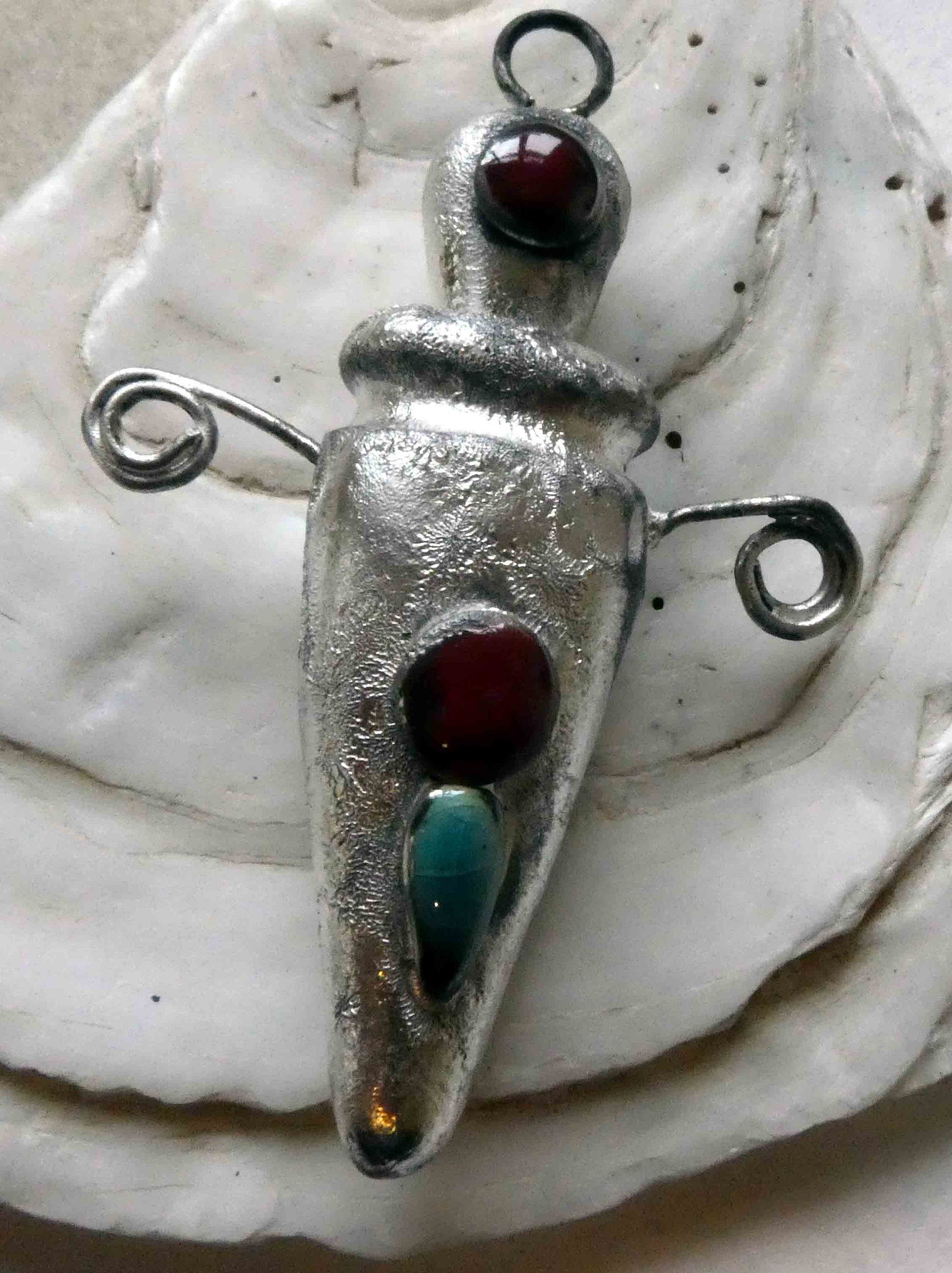 A silver amphora pendant. Hand sculpted in Earthstone, with embedded side hoops .High fired. Fired again with Red and Topaz glaze. Then applied .999 Fine silver and fired once again. The stopper fits fairly snugly, so it could be used to hold essential oil. 2 inches, and lightweight. ©ScorchedEarthDesigns