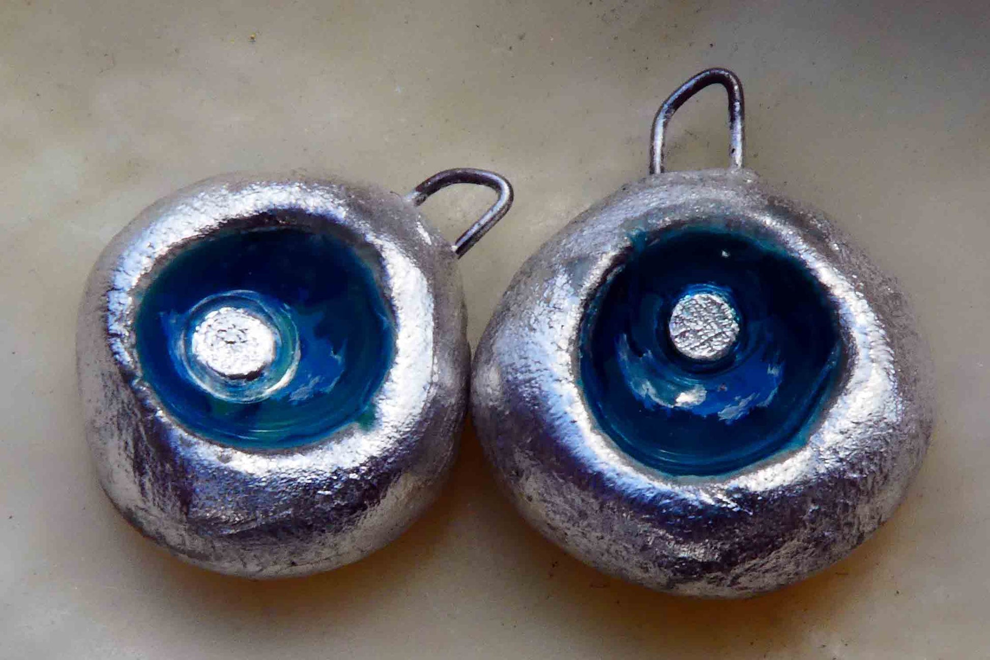 Hand formed in Earthstone, and high fired. Then fired again with Deep Turquoise enamel and a .999 Fine Silver granule. Applied with .999 Fine Silver and fired again.