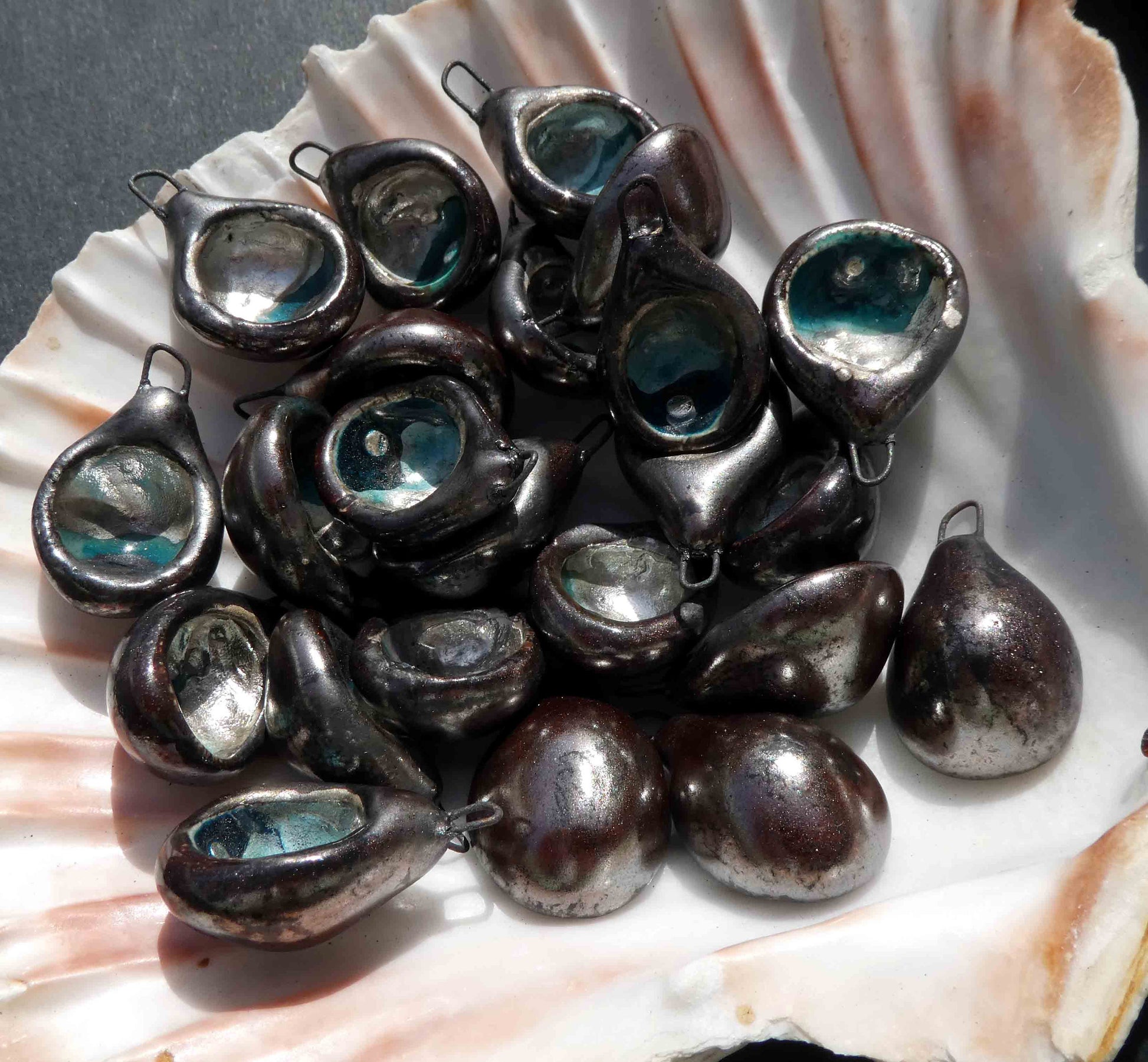 A pair of glazed, silvery hollow chamber drops on hoops. Hand formed, hollow chambers in Earthstone. High fired. Fired again with Oriental Blue glaze and over-fired Sterling Silver, which has formed round nuggets in the glaze. Then applied with .999 Fine Silver paste, and fired again. 25mms and very lightweight. ©ScorchedEarthDesigns