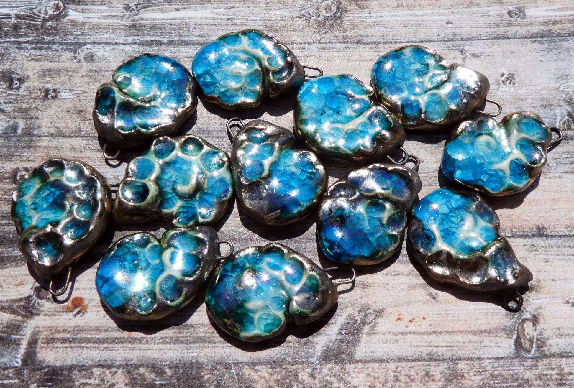 Hand formed in Earthstone and high fired. Fired again with bronze clay, chips of lustre glass and Moonscape Crackle glaze.