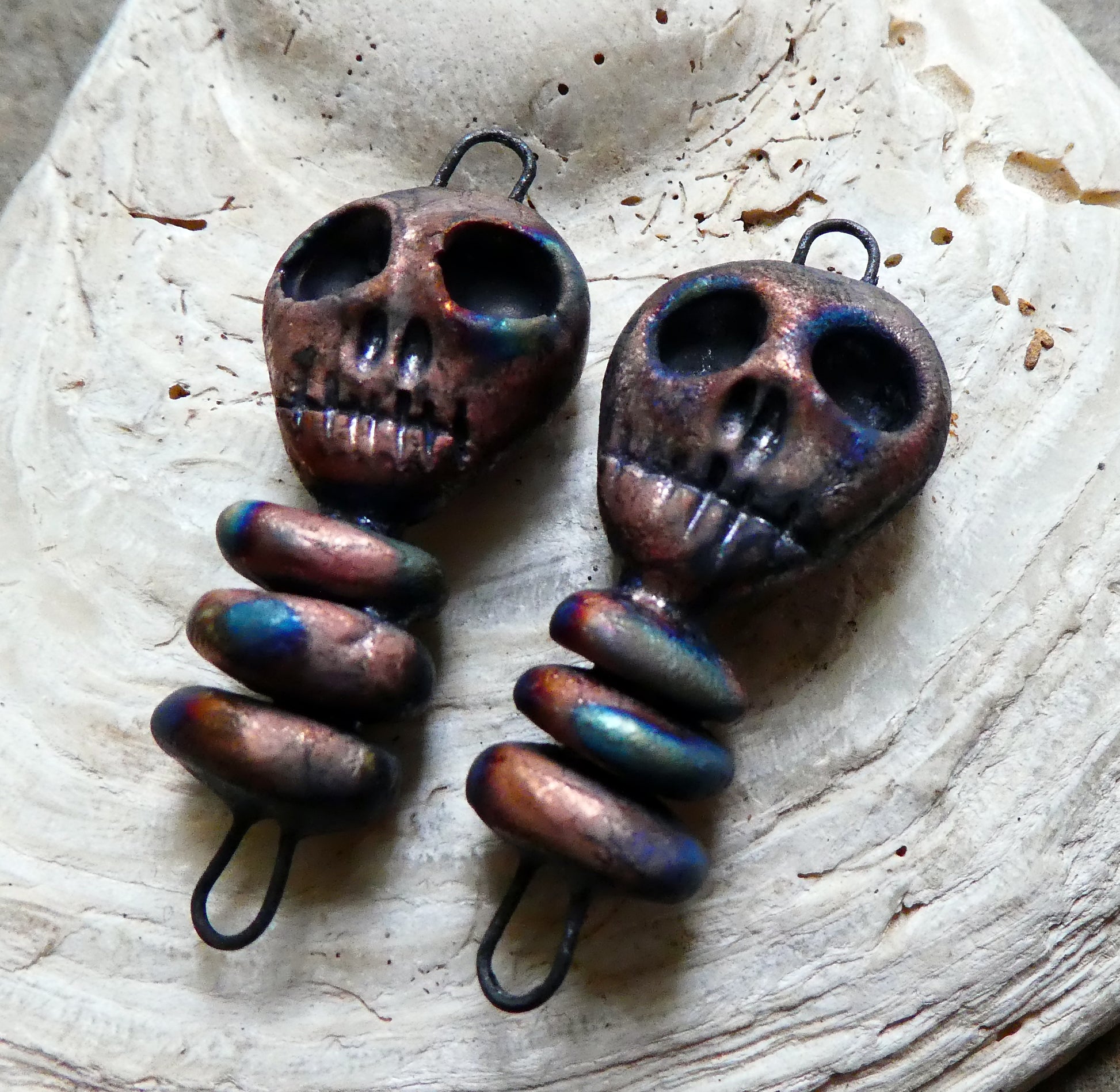 Hand formed in Earthstone and high fired. Then fired again with bronze clay. Scorched on the bottoms to a rainbow finish.