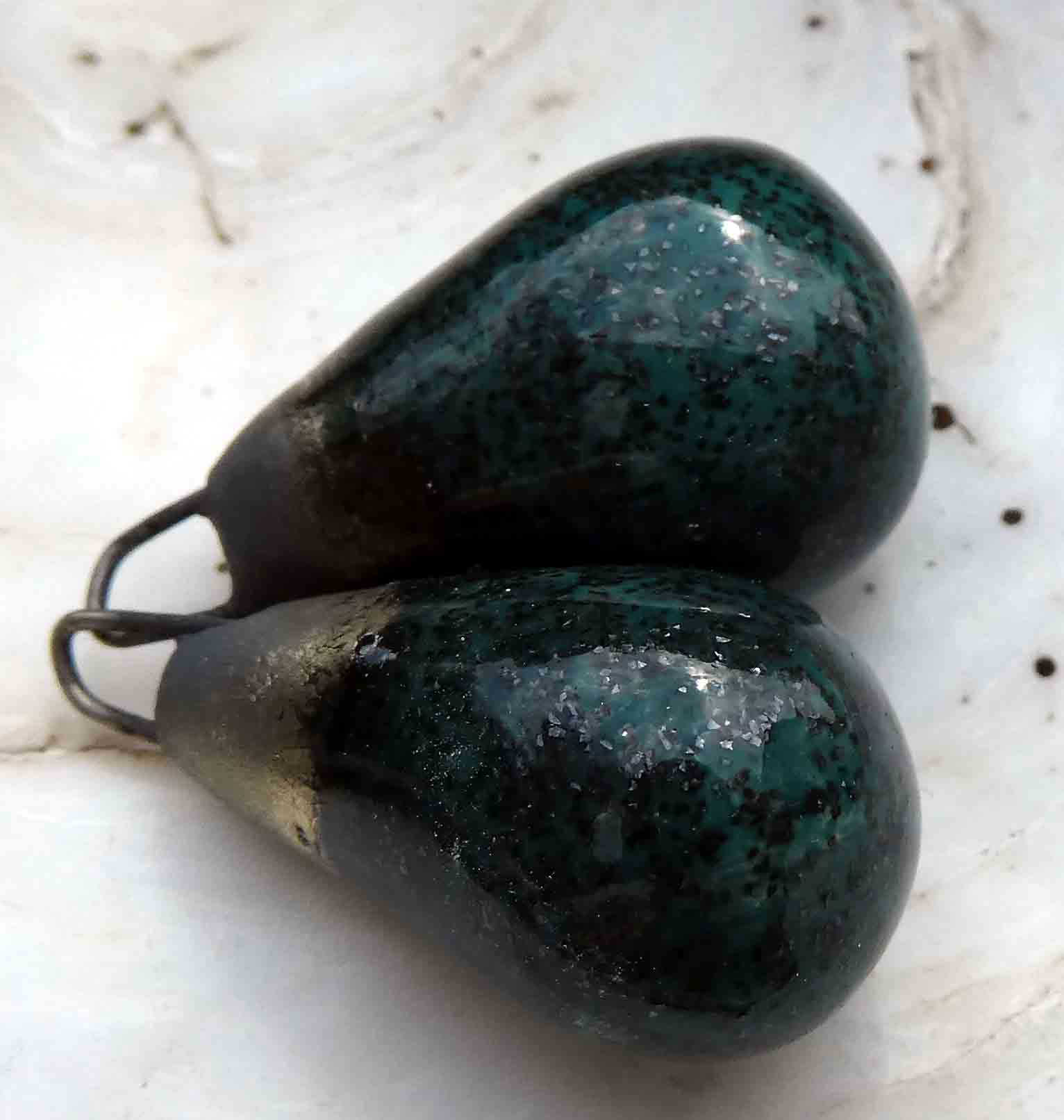 A pair of glazed drops on hoops. Hand formed in Earthstone , and fired with Bronze clay and Aquamarine Shimmer glaze. All slightly different, but on average 20mms plus the hoop, and very lightweight. ©ScorchedEarthDesigns