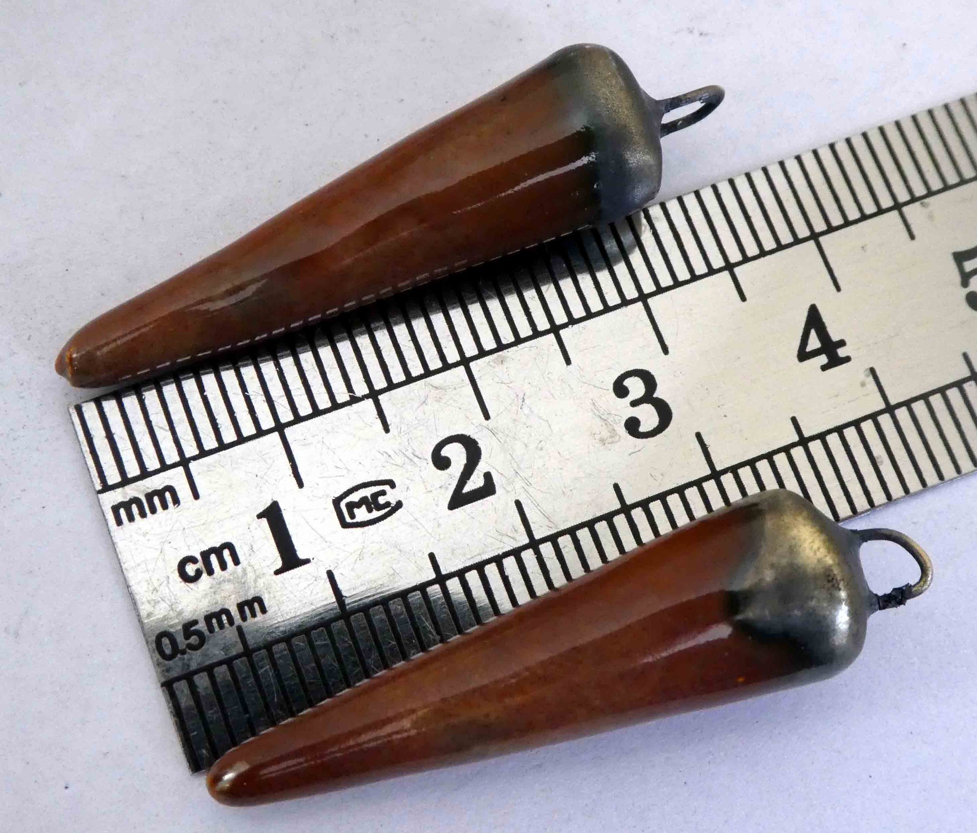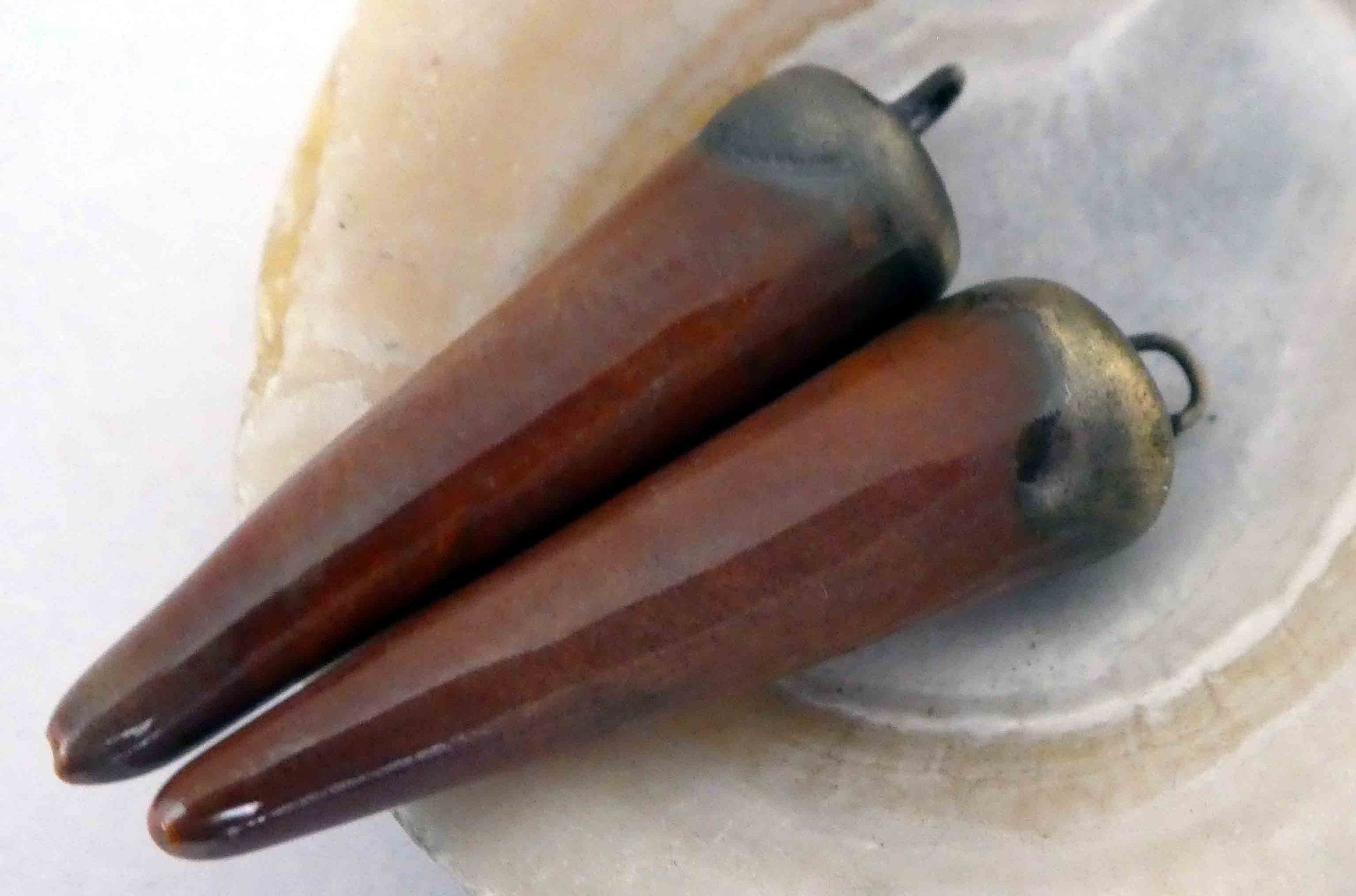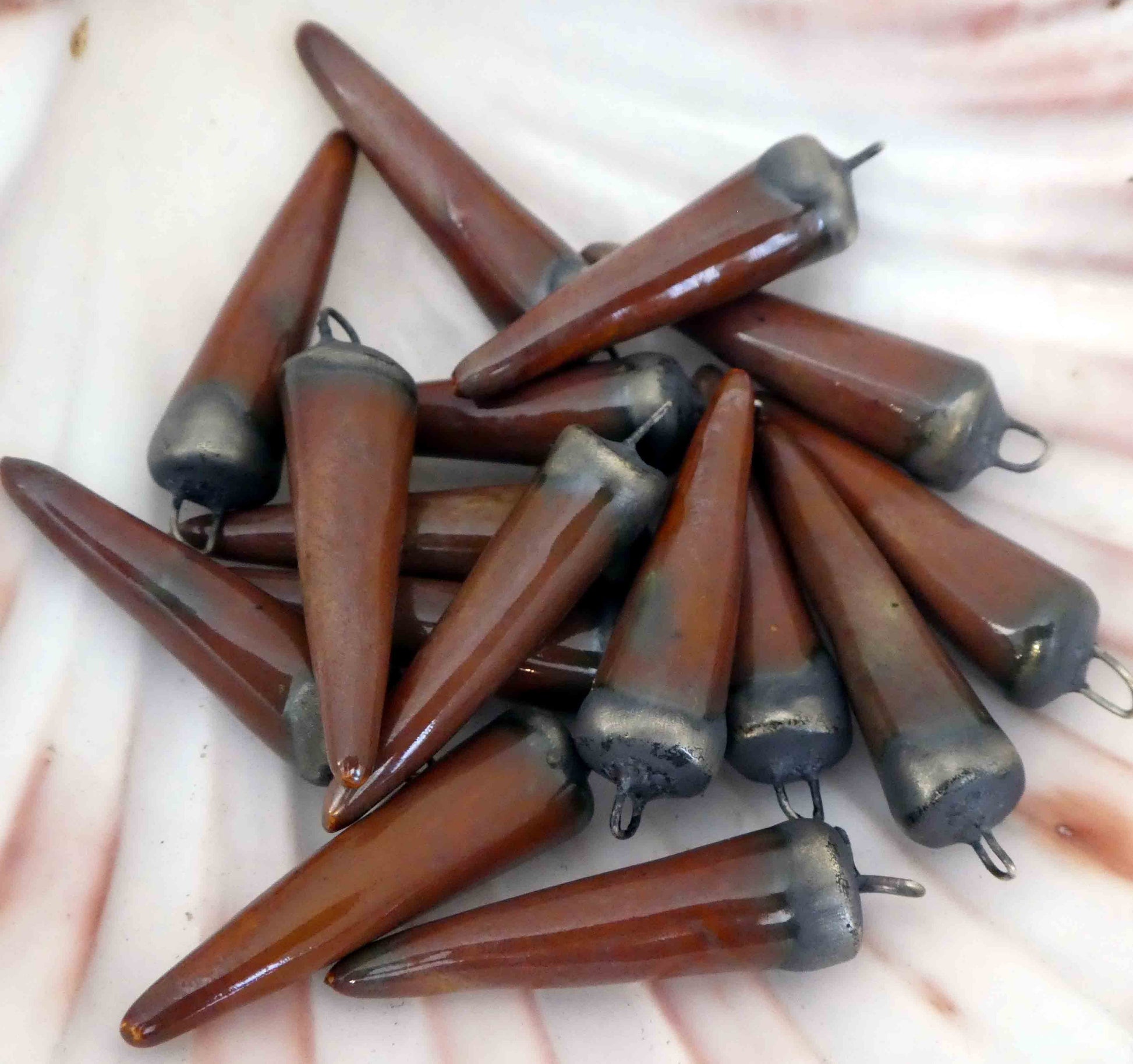 A pair of glazed spikes on hoops. Hand formed in Earthstone , and fired with Bronze clay and Cactus Flower glaze. All slightly different, but on average 35mms plus the hoop, and very lightweight. ©ScorchedEarthDesigns