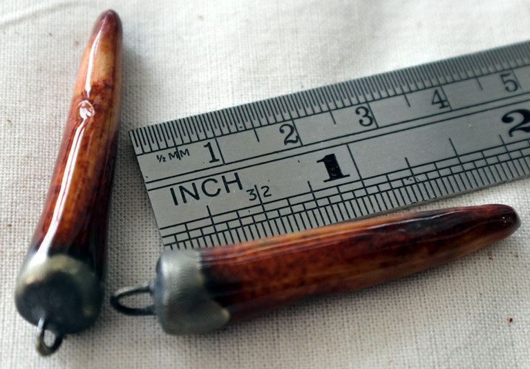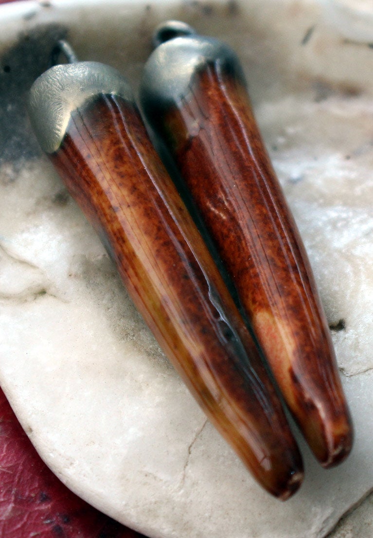 A pair of glazed spikes on hoops. Hand formed in Earthstone, and fired with Bronze clay and Dragon's Breath glaze. All slightly different, but on average 35mms, plus the hoop. ©ScorchedEarthDesigns