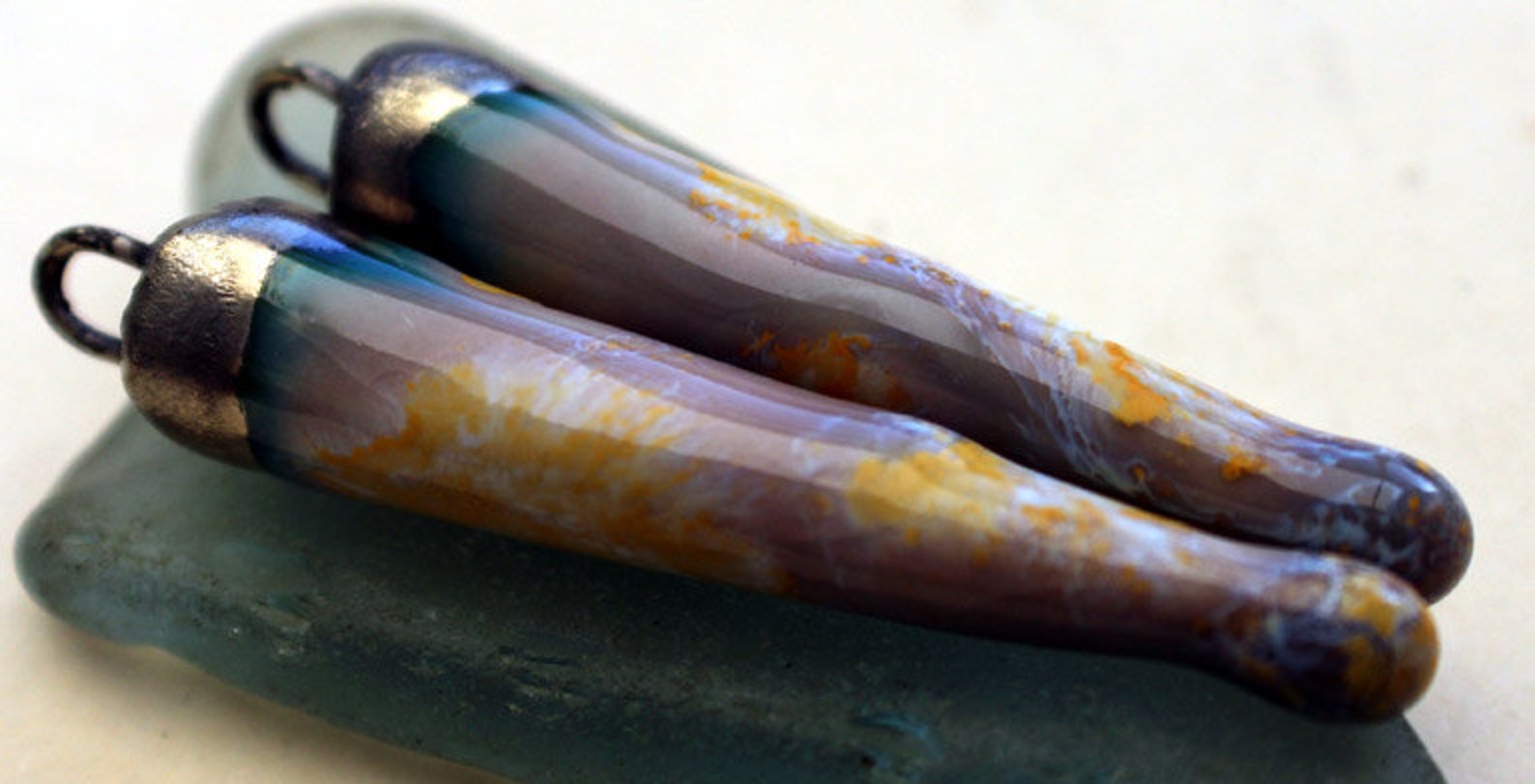 A pair of glazed spikes on hoops. Formed in Earthstone , and fired with Polynesian Lagoon glaze and Bronze clay. All slightly different, but on average 35mms, plus the hoop. ©ScorchedEarthDesigns