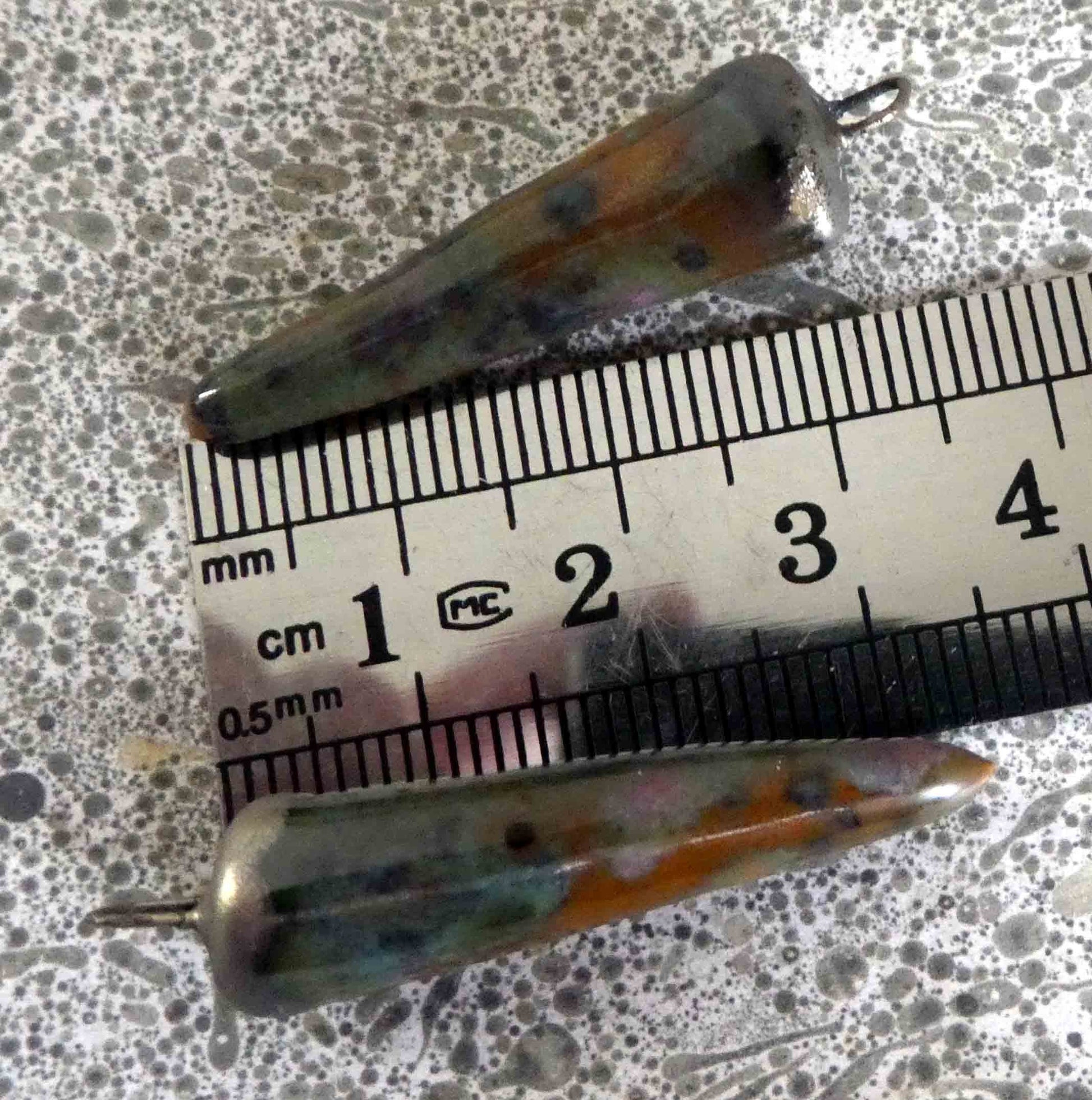 A pair of glazed spikes on hoops. Hand formed in Earthstone , and fired with Bronze clay and Field and Flowers glaze. All slightly different, but on average 35mms and very lightweight. ©ScorchedEarthDesigns