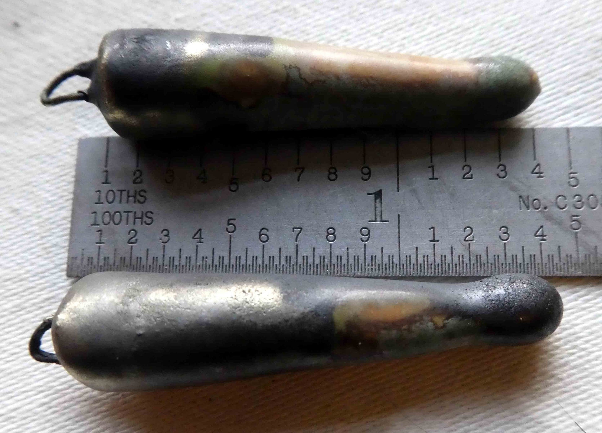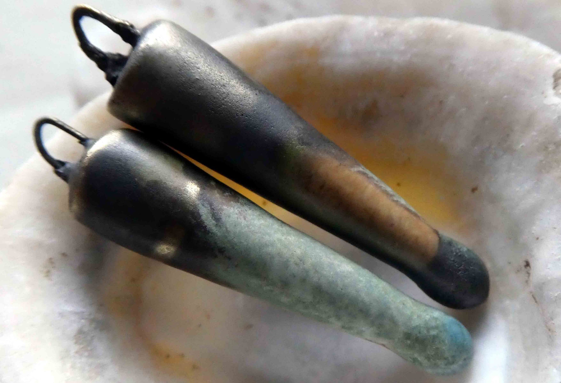 A pair of glazed spikes on hoops. Hand formed in Earthstone, and high fired with Bronze clay, and Galaxy Stoneware glaze. They're all slightly different, but on average are 35mms. ©ScorchedEarthDesigns