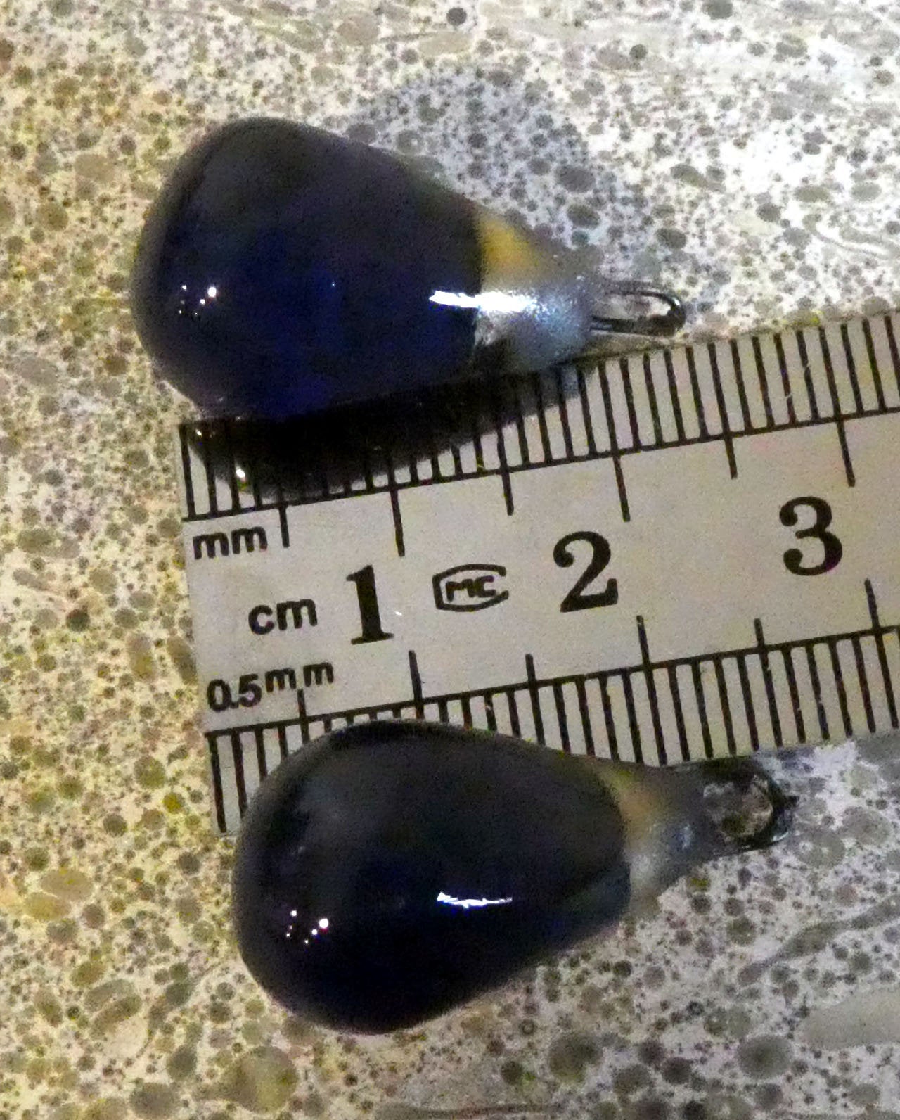 A pair of glazed spikes on hoops. Hand formed in Earthstone , and fired with Bronze clay and Galaxy Blue glaze. All slightly different, but on average 35mms plus the hoop, and very lightweight. ©ScorchedEarthDesigns