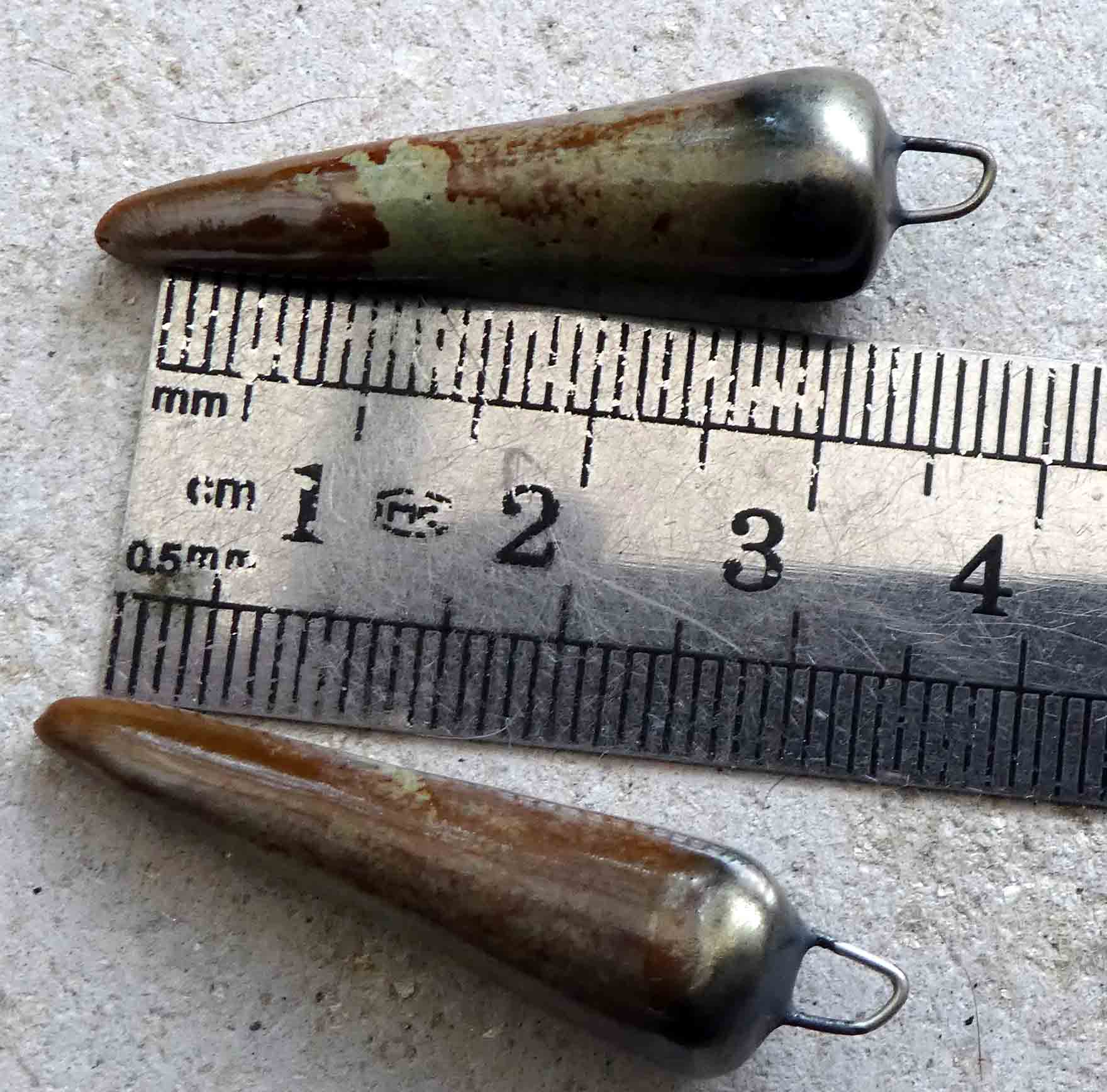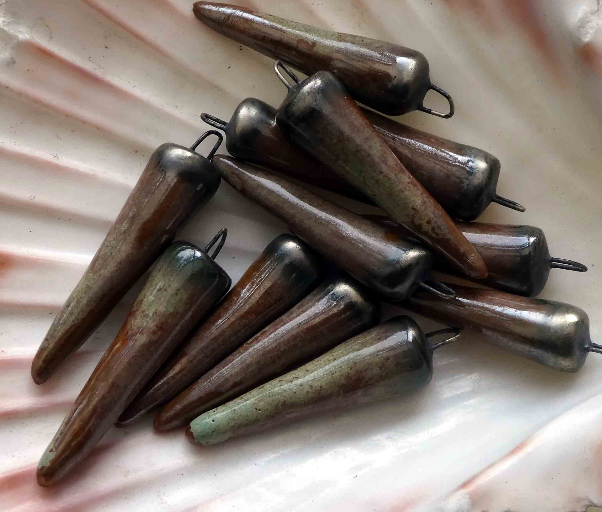 A pair of glazed spikes on hoops. Hand formed in Earthstone, and fired with Bronze clay and Muddy Waters glaze. 35mms, and very lightweight. ©ScorchedEarthDesigns