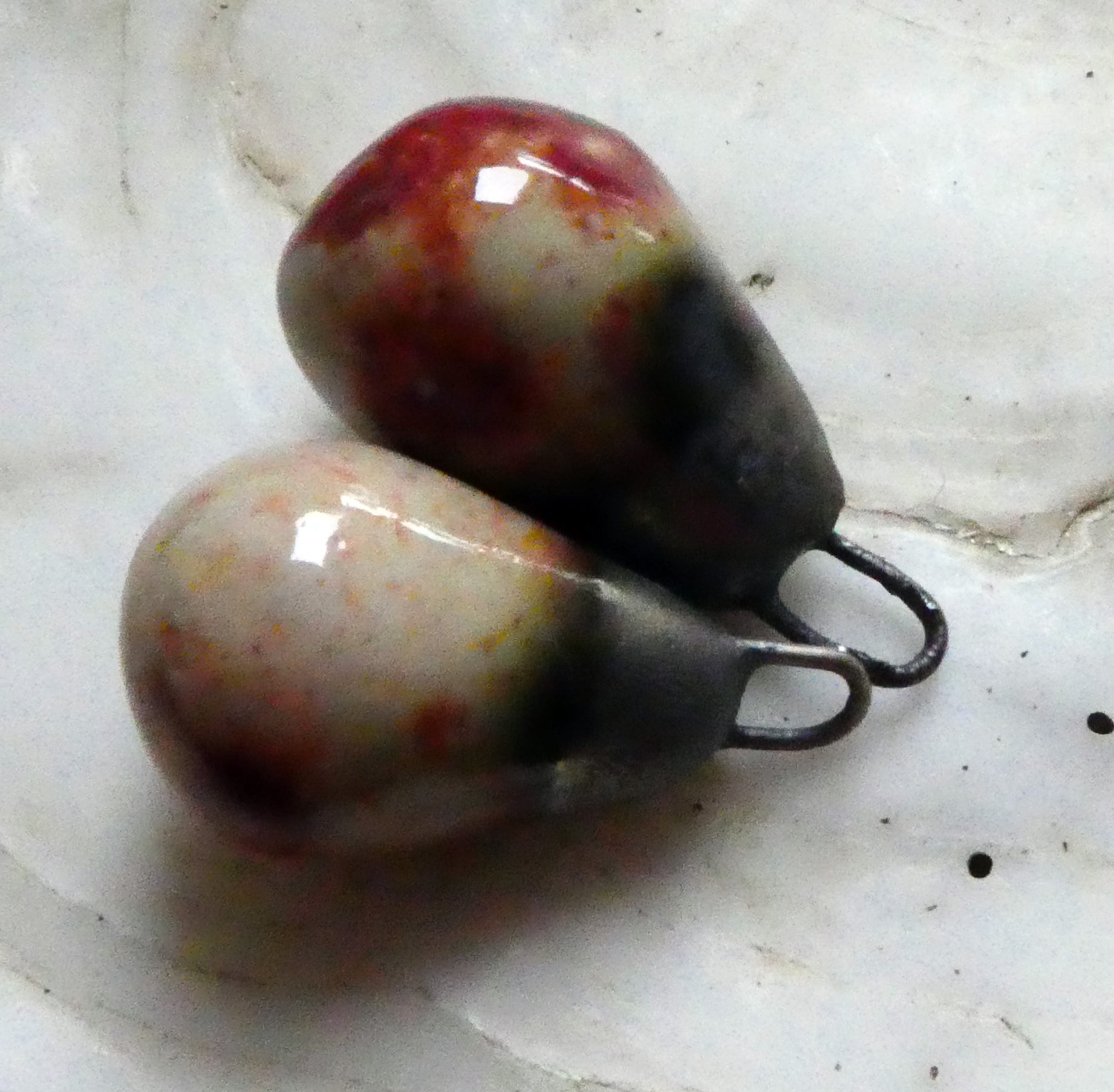 A pair of glazed drops on hoops. Formed in Earthstone, and fired with Mojave glaze and Bronze clay. All slightly different, but on average 20mms, plus the hoop. ©ScorchedEarthDesigns