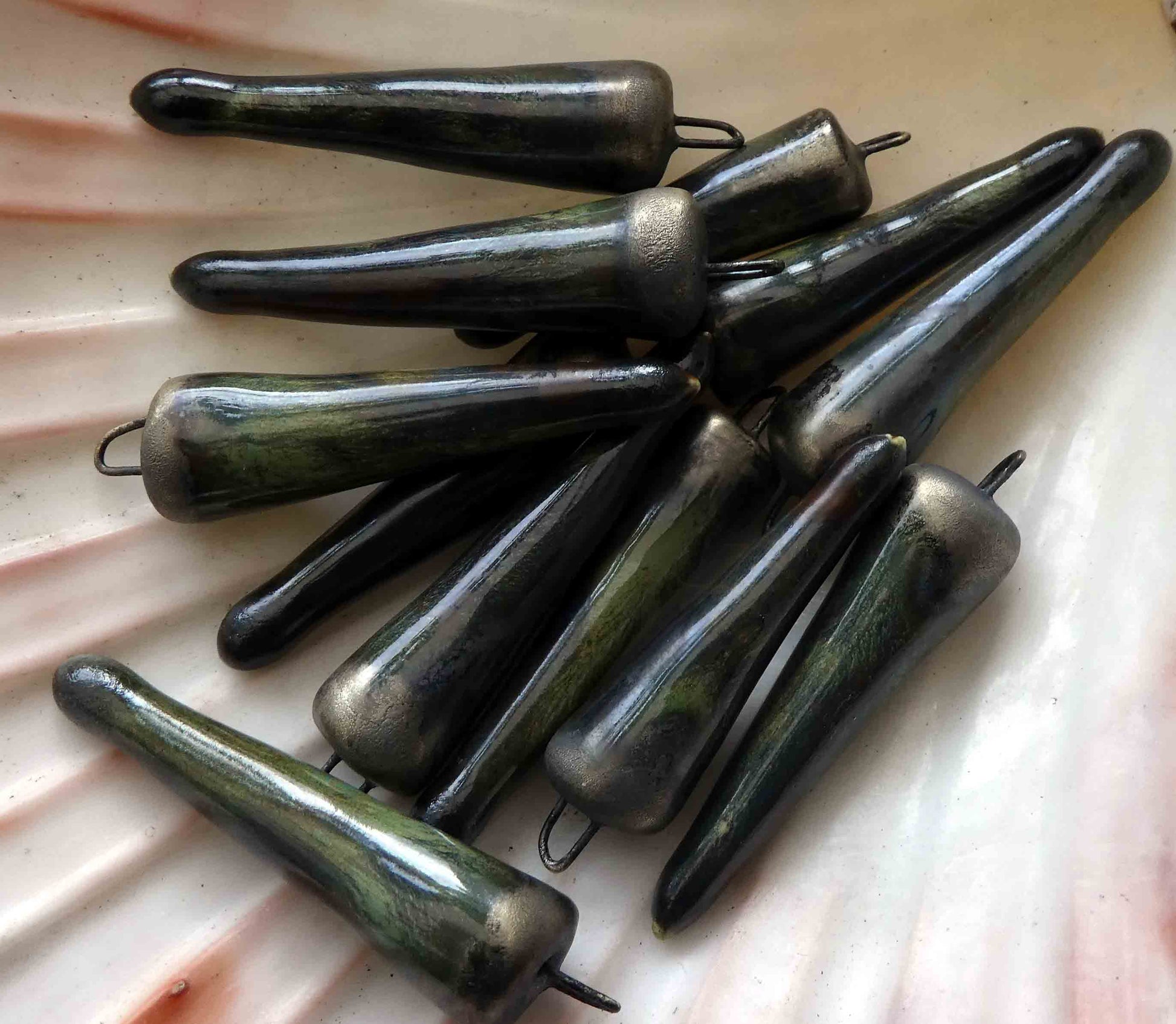 A pair of glazed spikes on hoops. Hand formed in Earthstone, and fired with Bronze clay and Malachite glaze. 35mms, and very lightweight. ©ScorchedEarthDesigns