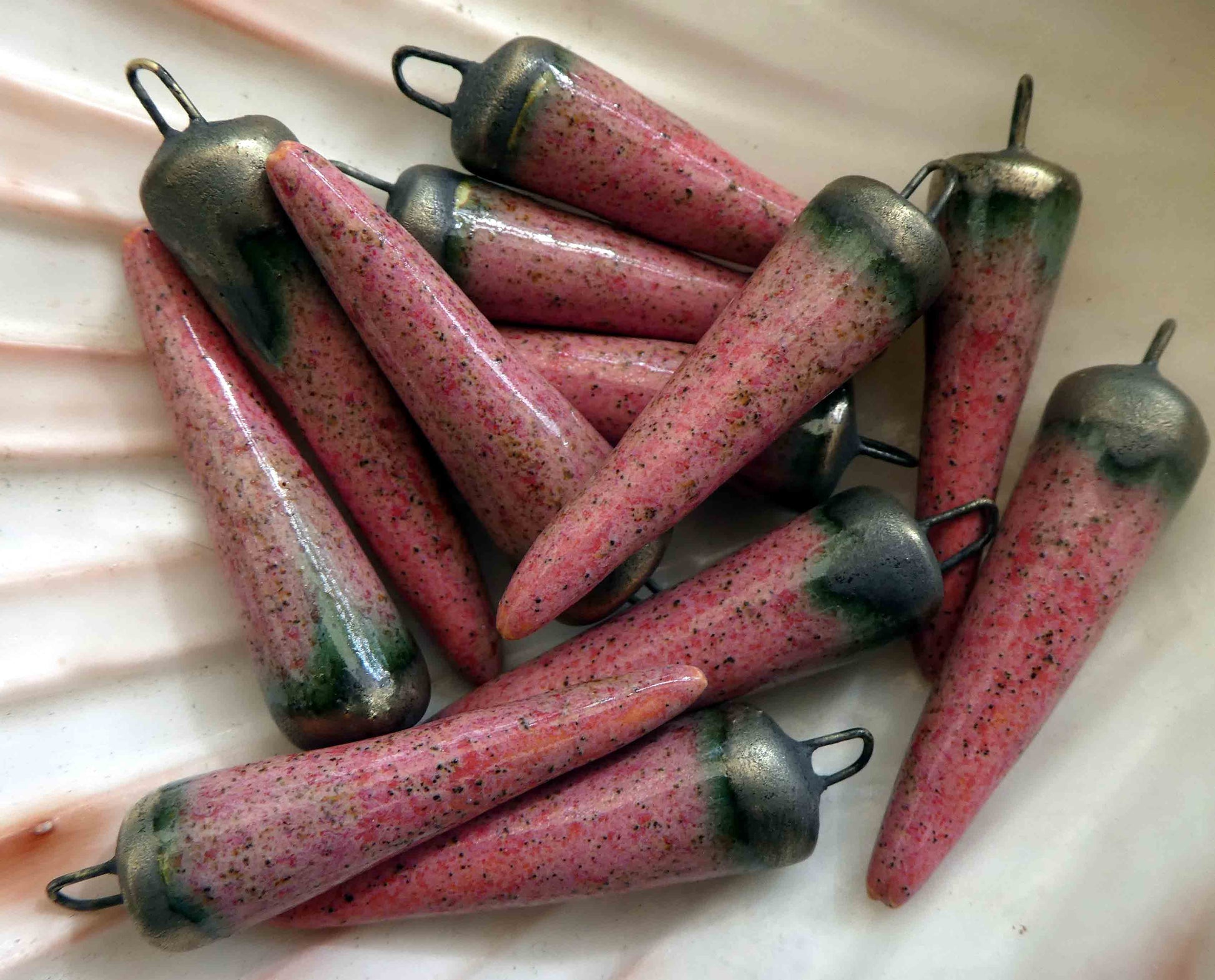 A pair of glazed spikes on hoops. Hand formed in Earthstone, and fired with Rose Quartz glaze and Bronze clay. All slightly different, but roughly 35mms in length, plus the hoop. ©ScorchedEarthDesigns