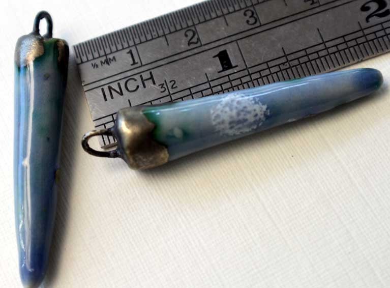 A pair of glazed spikes on hoops. Formed in Earthstone, and fired with Sky Diamonds glaze and Bronze clay. All slightly different, but on average 35mms, plus the hoop. ©ScorchedEarthDesigns