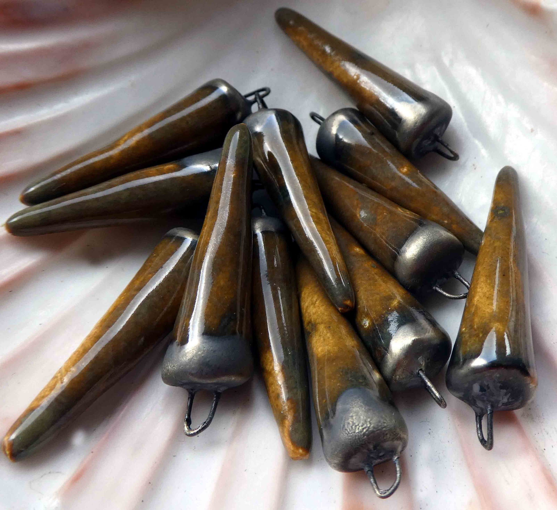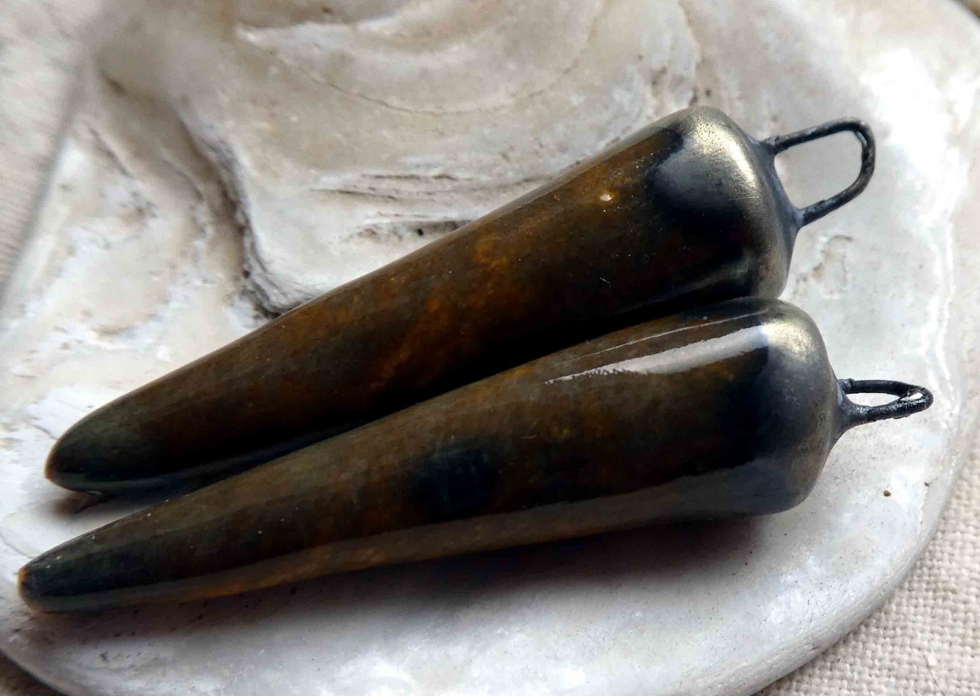 A pair of glazed spikes on hoops. Formed in Earthstone, and fired with Spring Mist glaze and Bronze clay. All slightly different, but on average 35mms, plus the hoop. ©ScorchedEarthDesigns