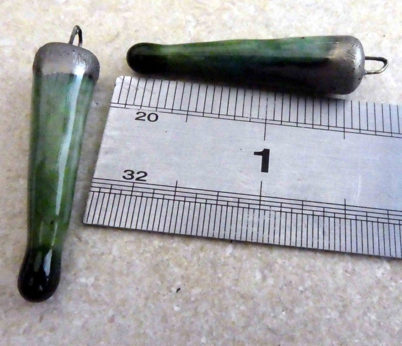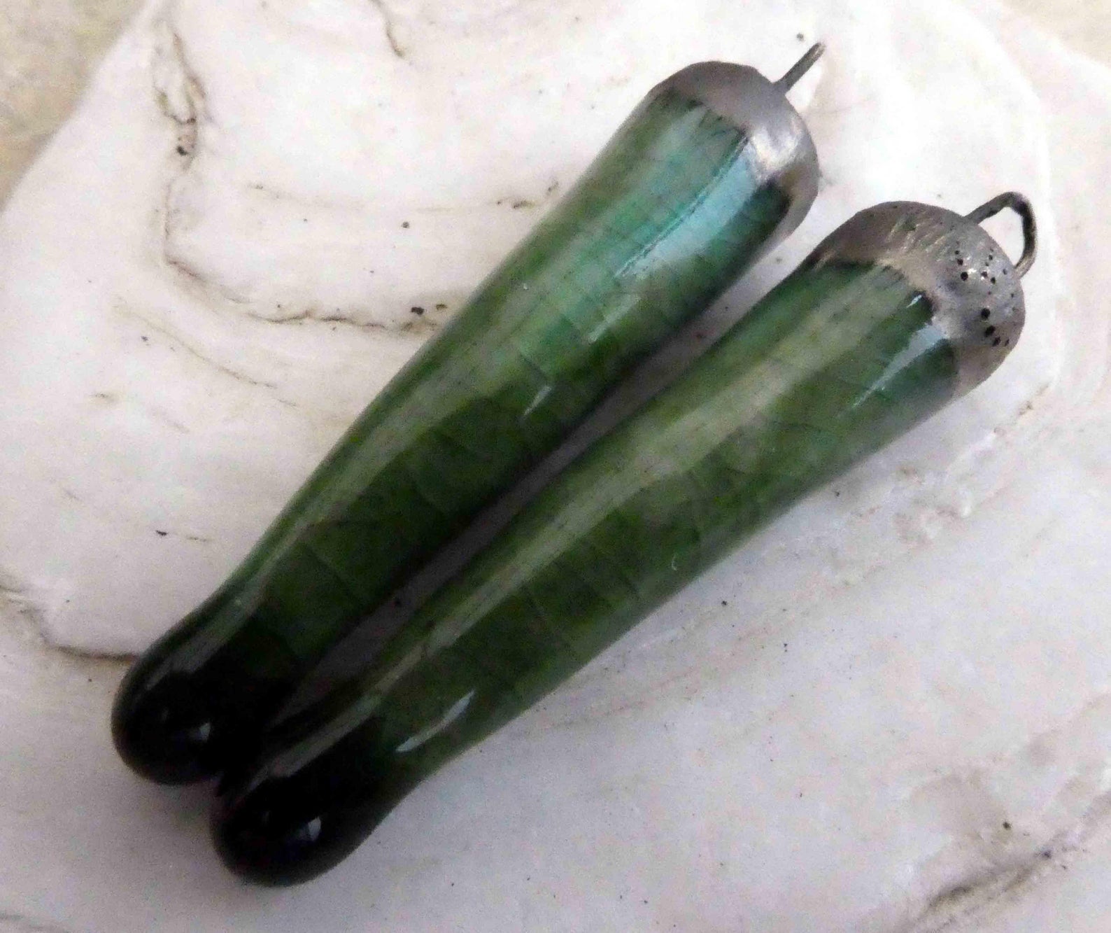 A pair of glazed spikes on hoops. Hand formed in Earthstone, and fired with Bronze clay, and Algae Bloom glaze. All slightly different, but roughly 35mms in length, and very lightweight. ©ScorchedEarthDesigns