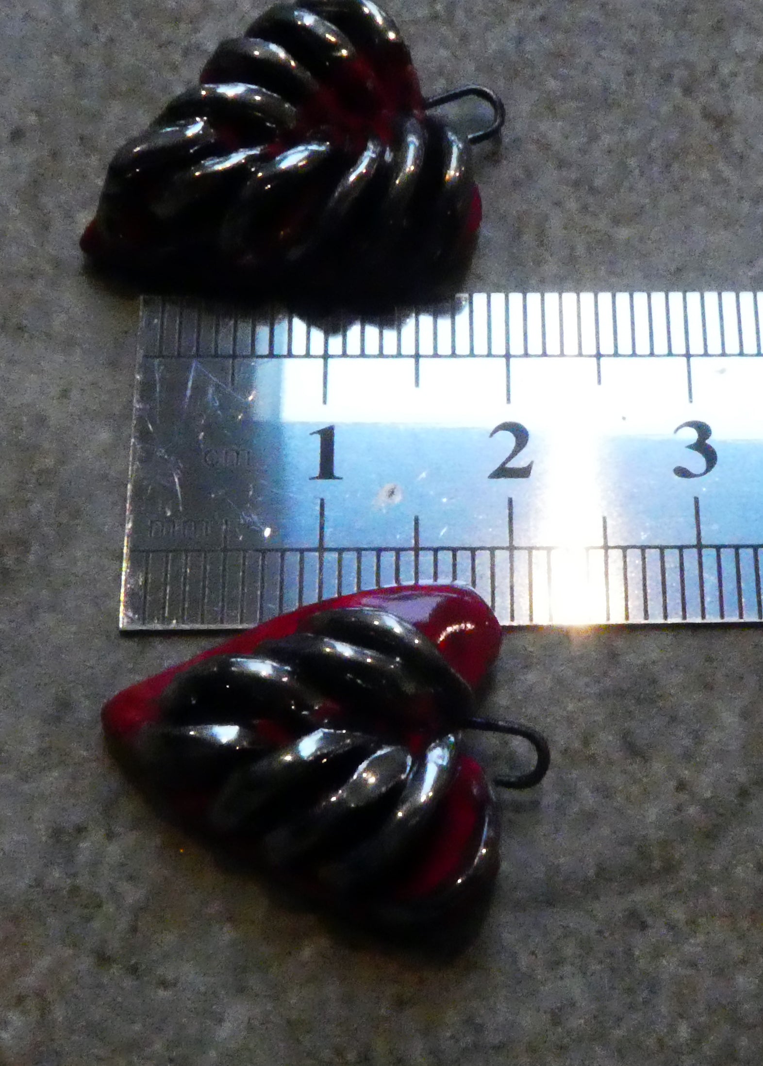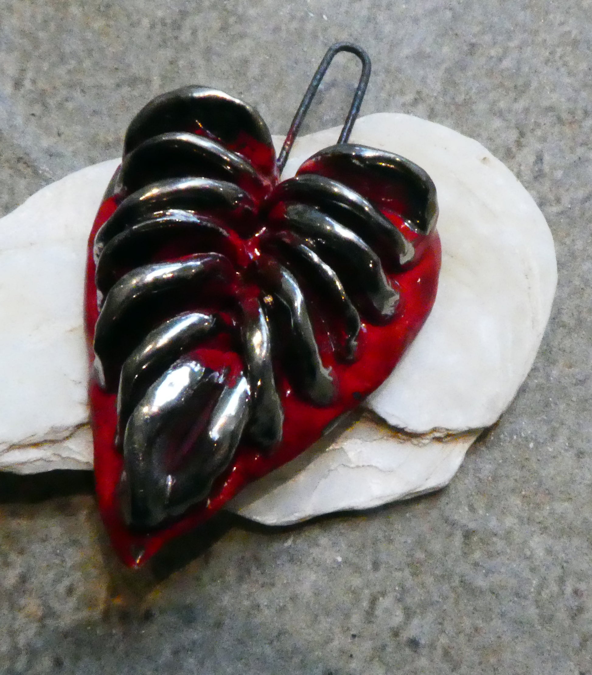 Hand formed in Earthstone and high fired. Then fired again with Black and Red glaze. Fired once more with Platinum lustre.
