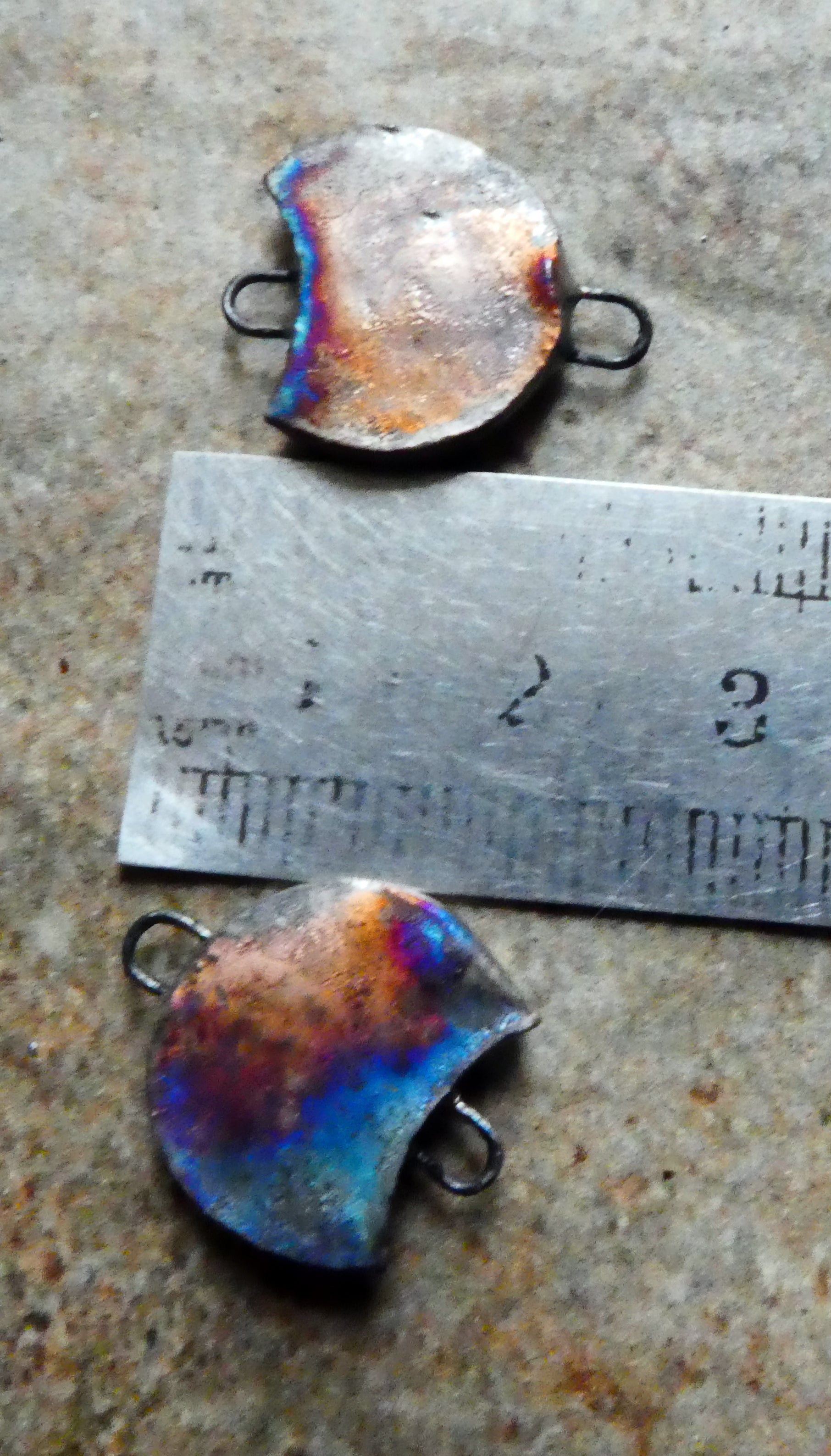 Hand formed in Earthstone, and high fired. Then fired again with bronze clay and Gloss glaze. Applied with decals and fired again. Scorched on the backs to a coppery rainbow finish.