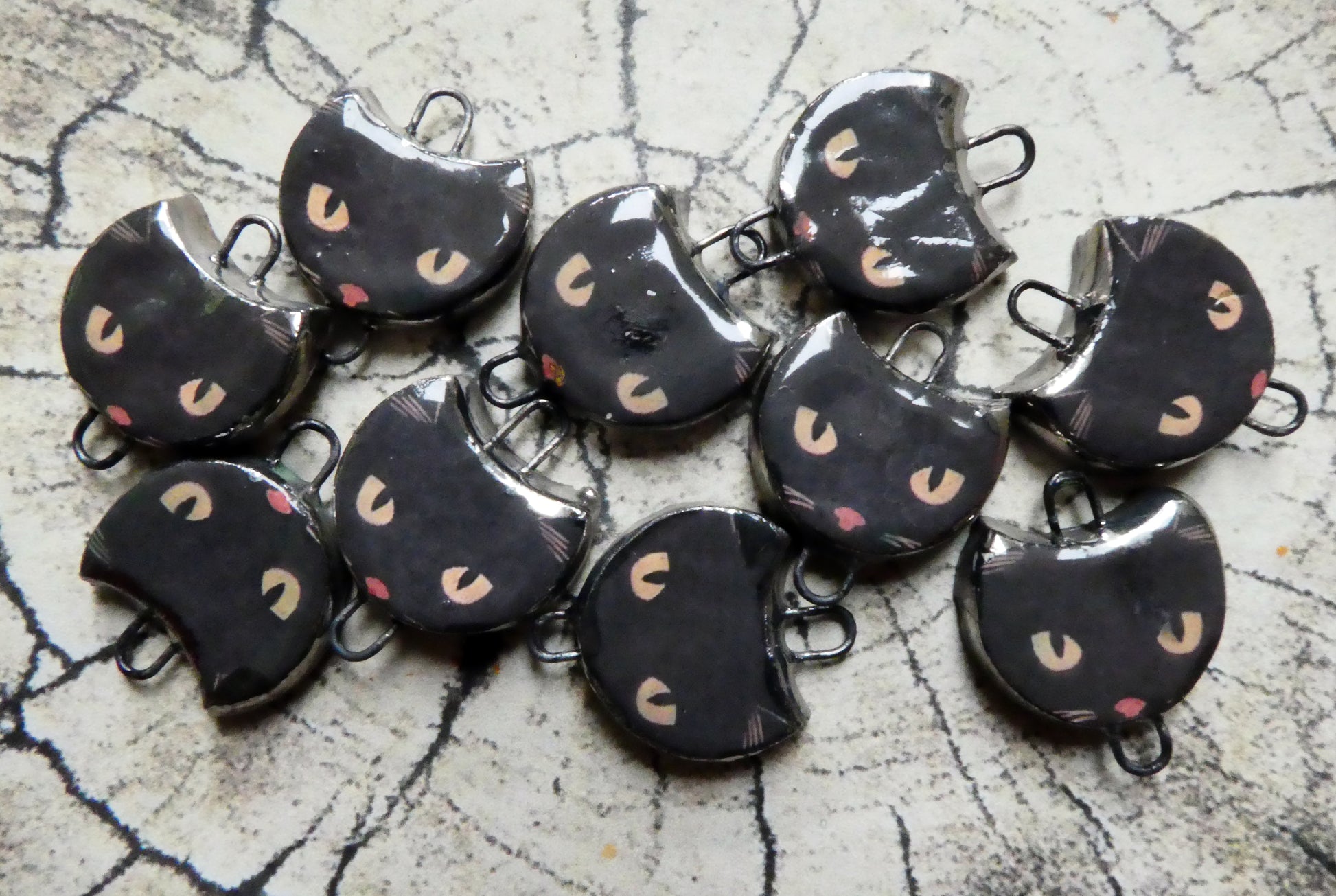 A pair of spooky cat earring connectors.
