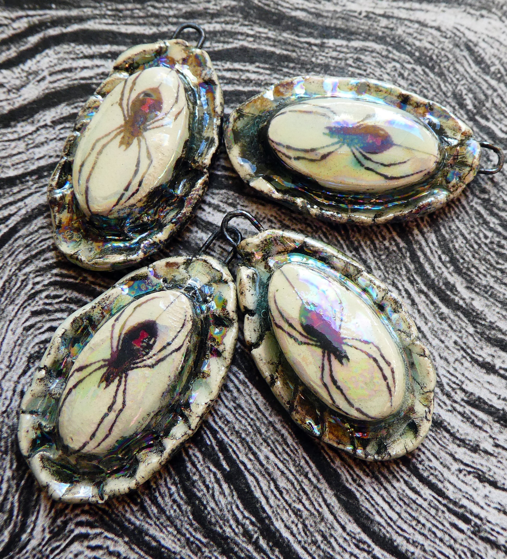 Hand formed in Earthstone and high fired. Then fired oxide, and again with Gloss glaze. Applied with spider decals and fired again, and then a fifth time with Mother of Pearl lustre.