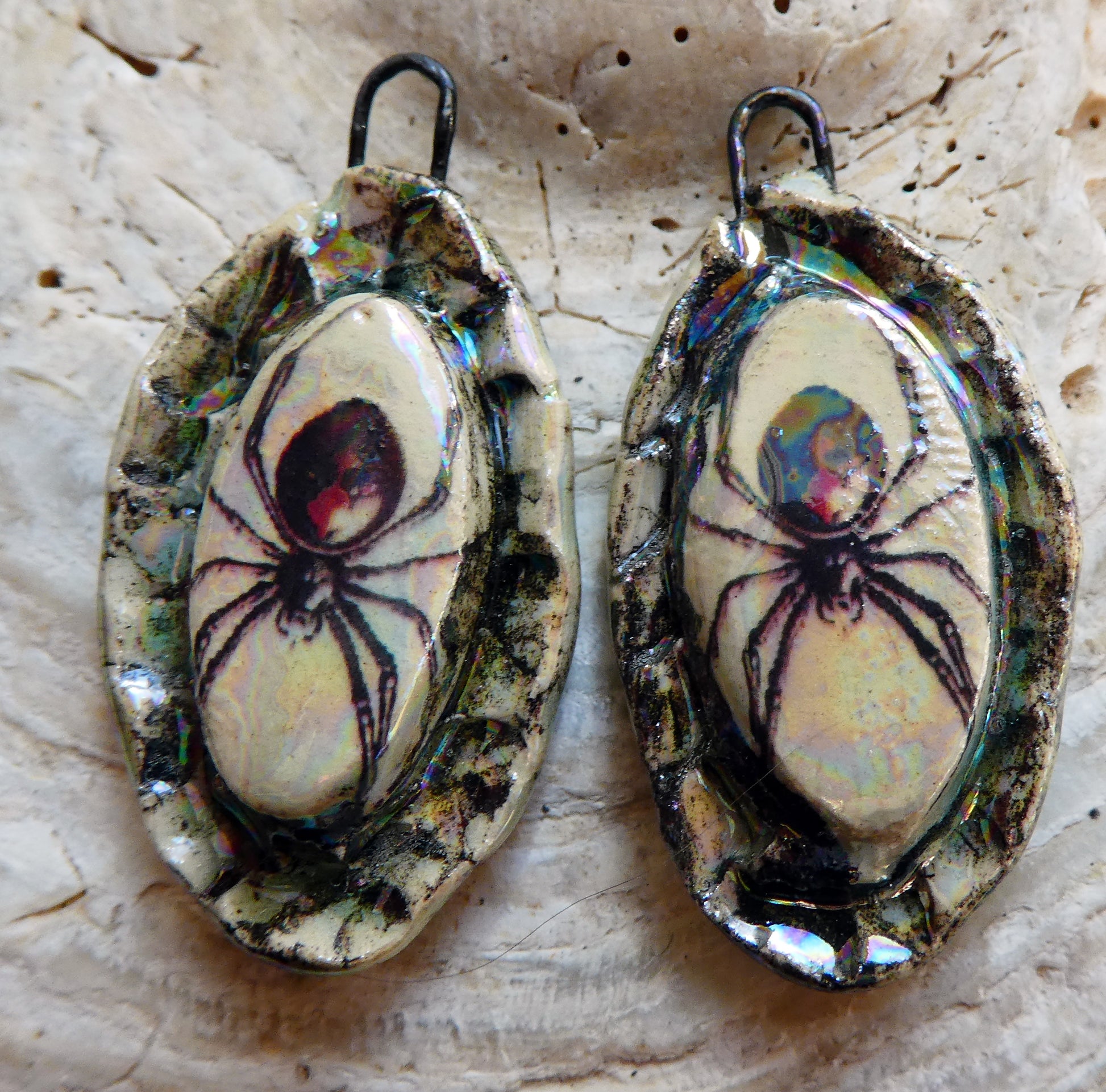 Hand formed in Earthstone and high fired. Then fired oxide, and again with Gloss glaze. Applied with spider decals and fired again, and then a fifth time with Mother of Pearl lustre.