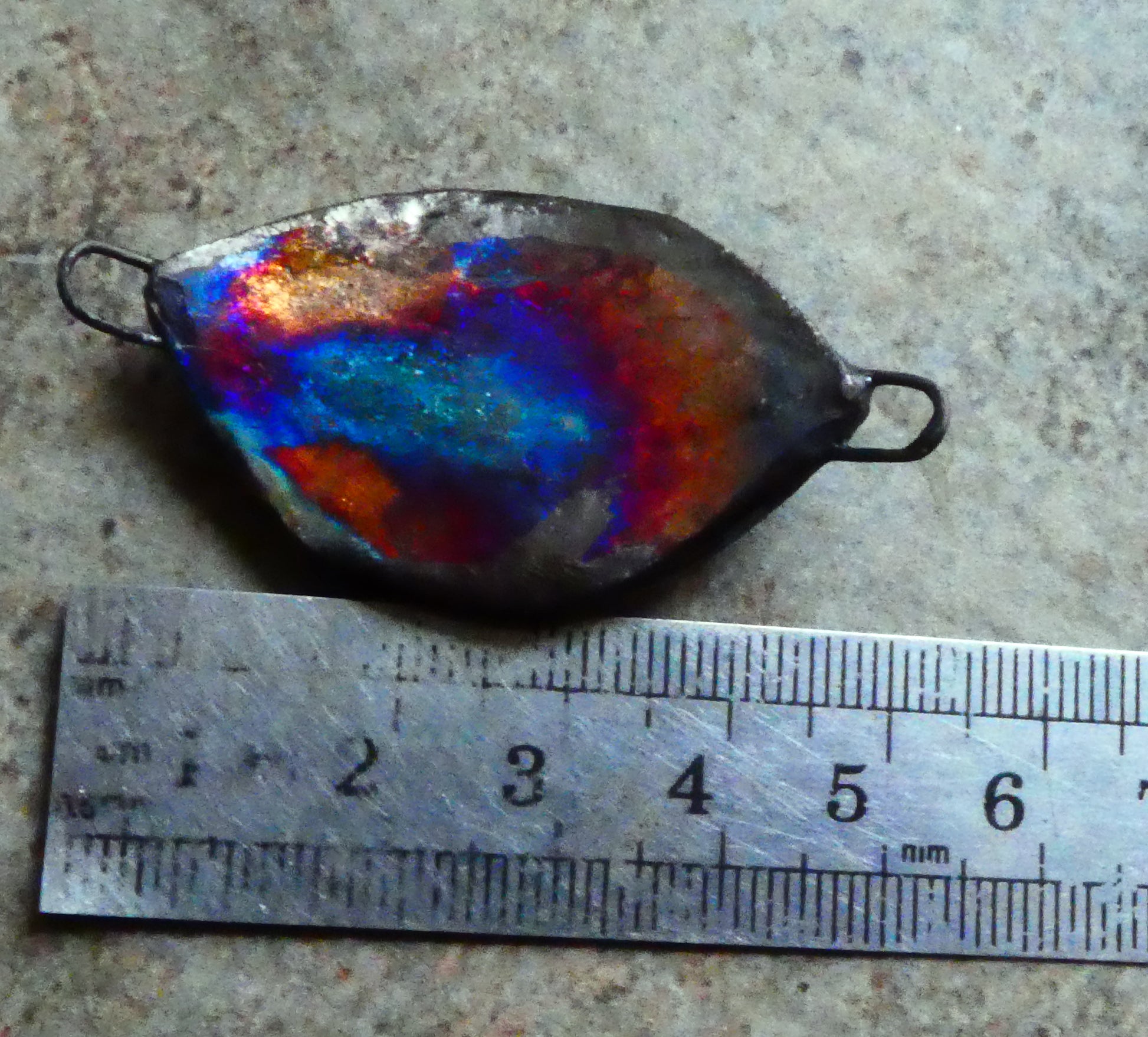 High fired, then fired again with gloss glaze and Bronze clay. Applied with a spooky eye decal and fired again with Black Lustre. Curved to fit a wrist.