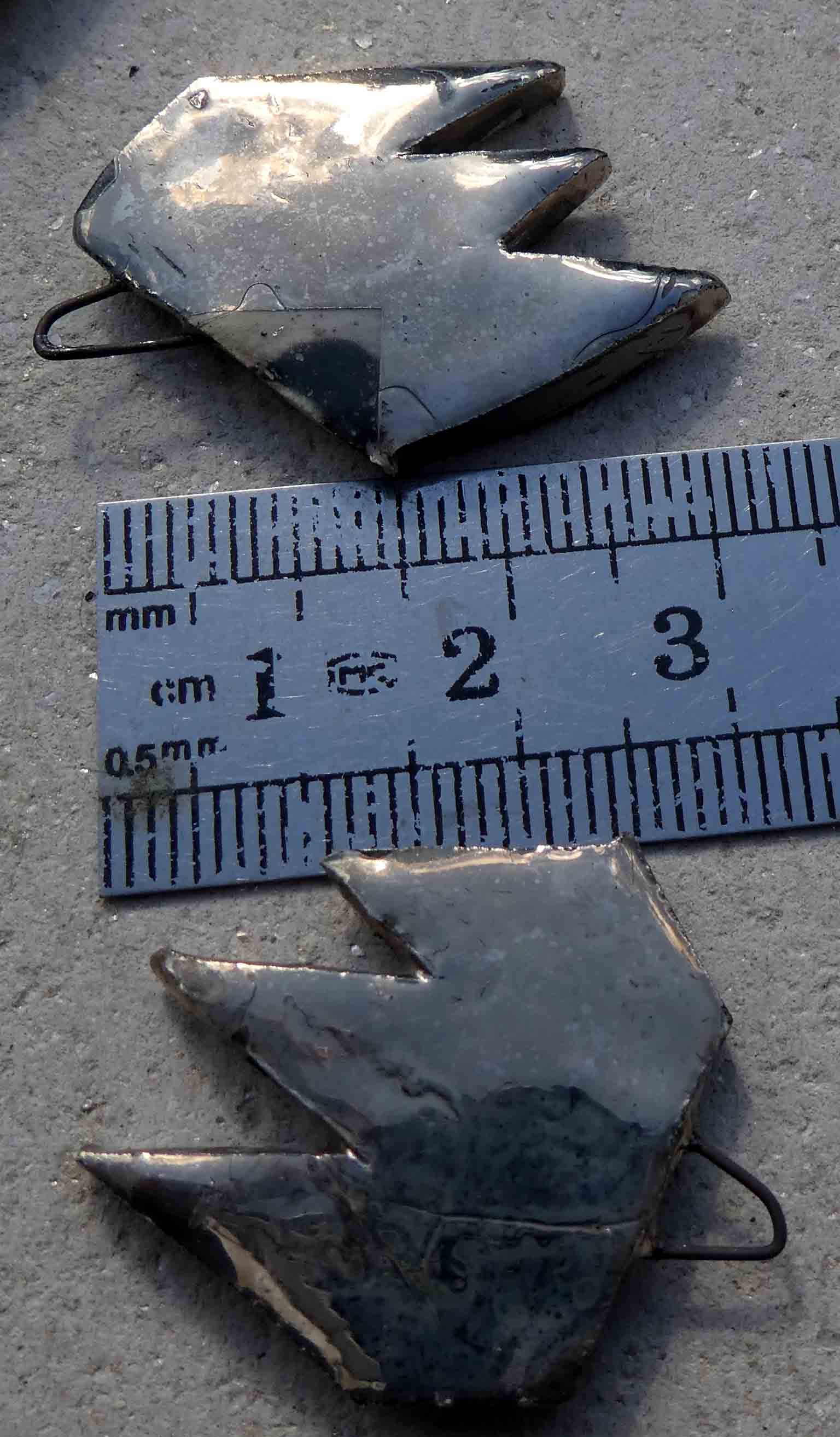 A pair of lightweight droppers. Hand formed, asymmetric, torn curtain shapes in Earthstone . High fired, then fired again with glossy glaze. Then applied with Terror decals and fired again with Platinum lustre. 25mms, and very lightweight. ©ScorchedEarthDesigns