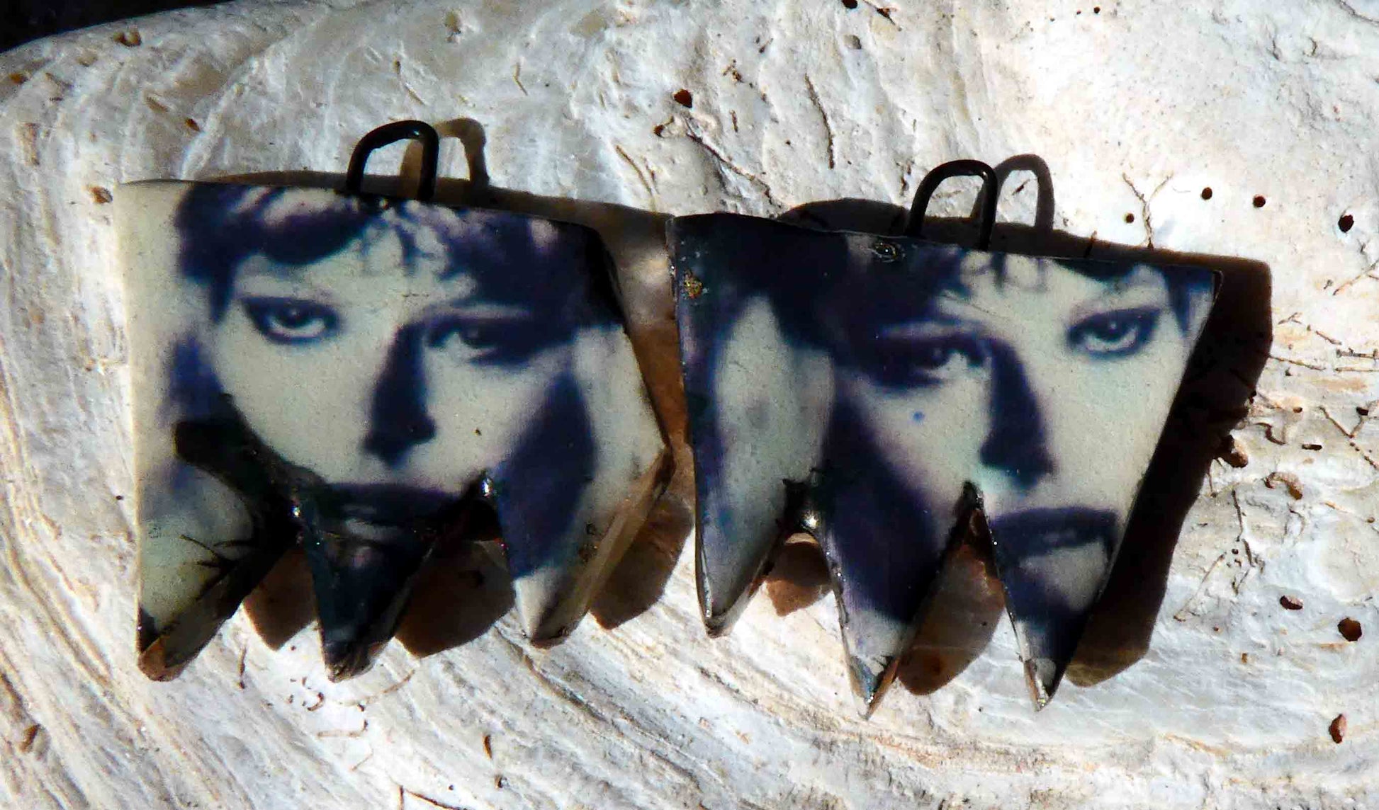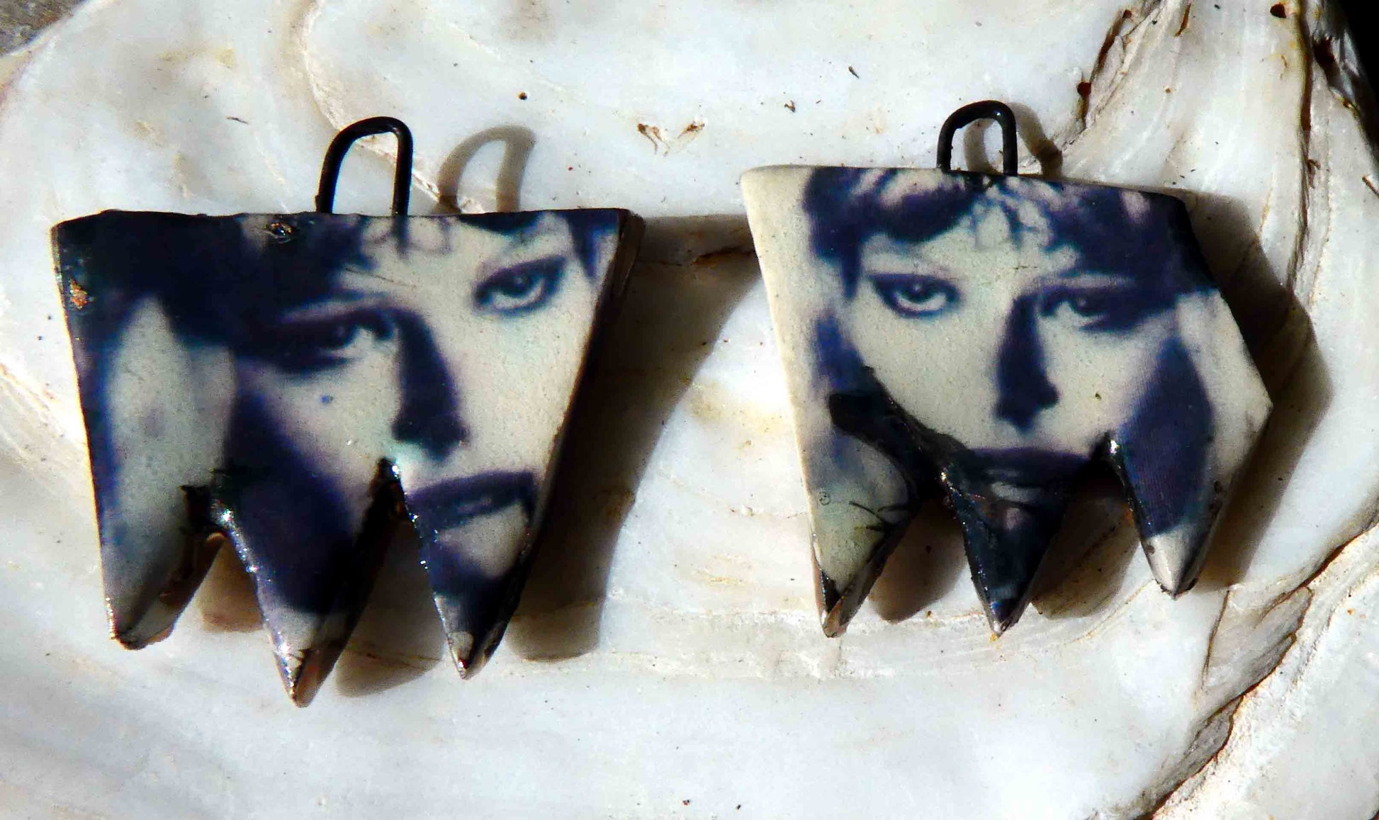 A pair of lightweight droppers. Hand formed, asymmetric, torn curtain shapes in Earthstone . High fired, then fired again with glossy glaze. Then applied with Terror decals and fired again with Platinum lustre. 25mms, and very lightweight. ©ScorchedEarthDesigns