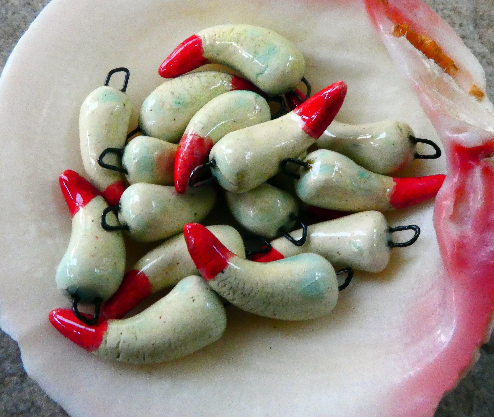 Hand formed in Earthstone, and high fired. Applied with Red and Ivory Crackle glaze and fired once more.
