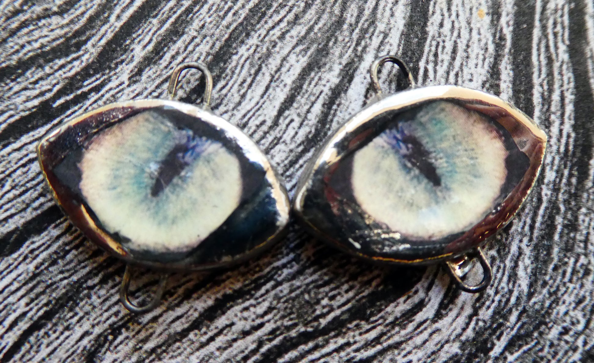 Hand formed, super slim droppers with a connection hoop on the bottoms, fired with gloss glaze and Bronze clay. Then applied with cats eyes decals and fired again with Lustre. Scorched to an irridescent finish on the backs.