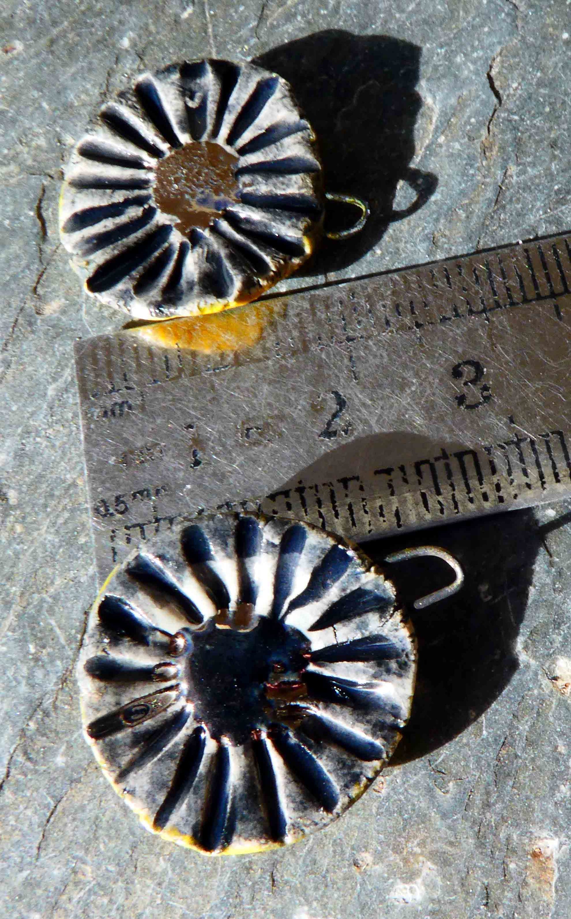 Hand formed in Earthstone and high fired. Then fired again with Bronze clay, Wildfire, Black and gloss glaze. Applied with Platinum lustre on the back and fired again.