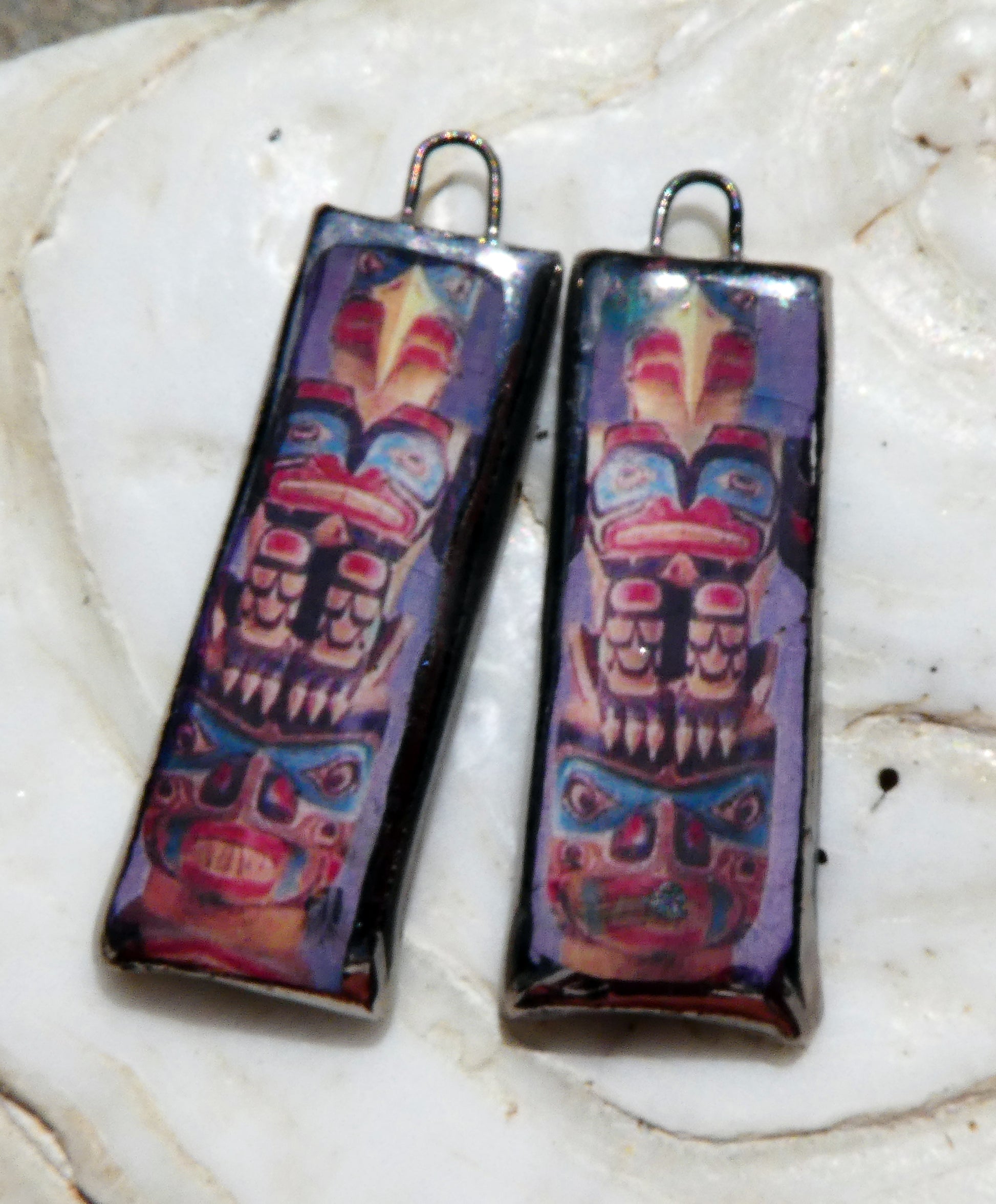 Hand formed in Earthstone and high fired. Fired again with gloss glaze and Bronze clay. Then applied with totem pole decals and fired with lustre to a smooth and hard-wearing, waterproof finish. Scorched to a rainbow finish on the backs.