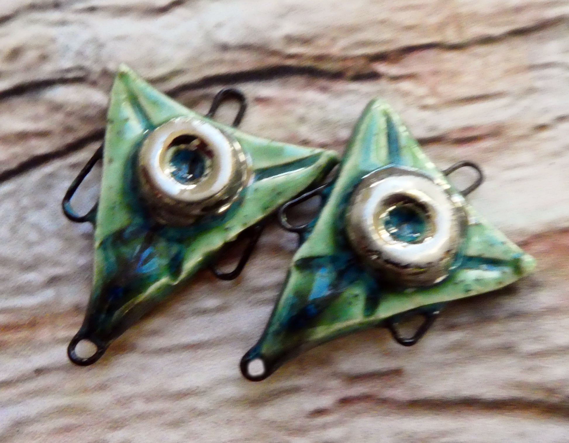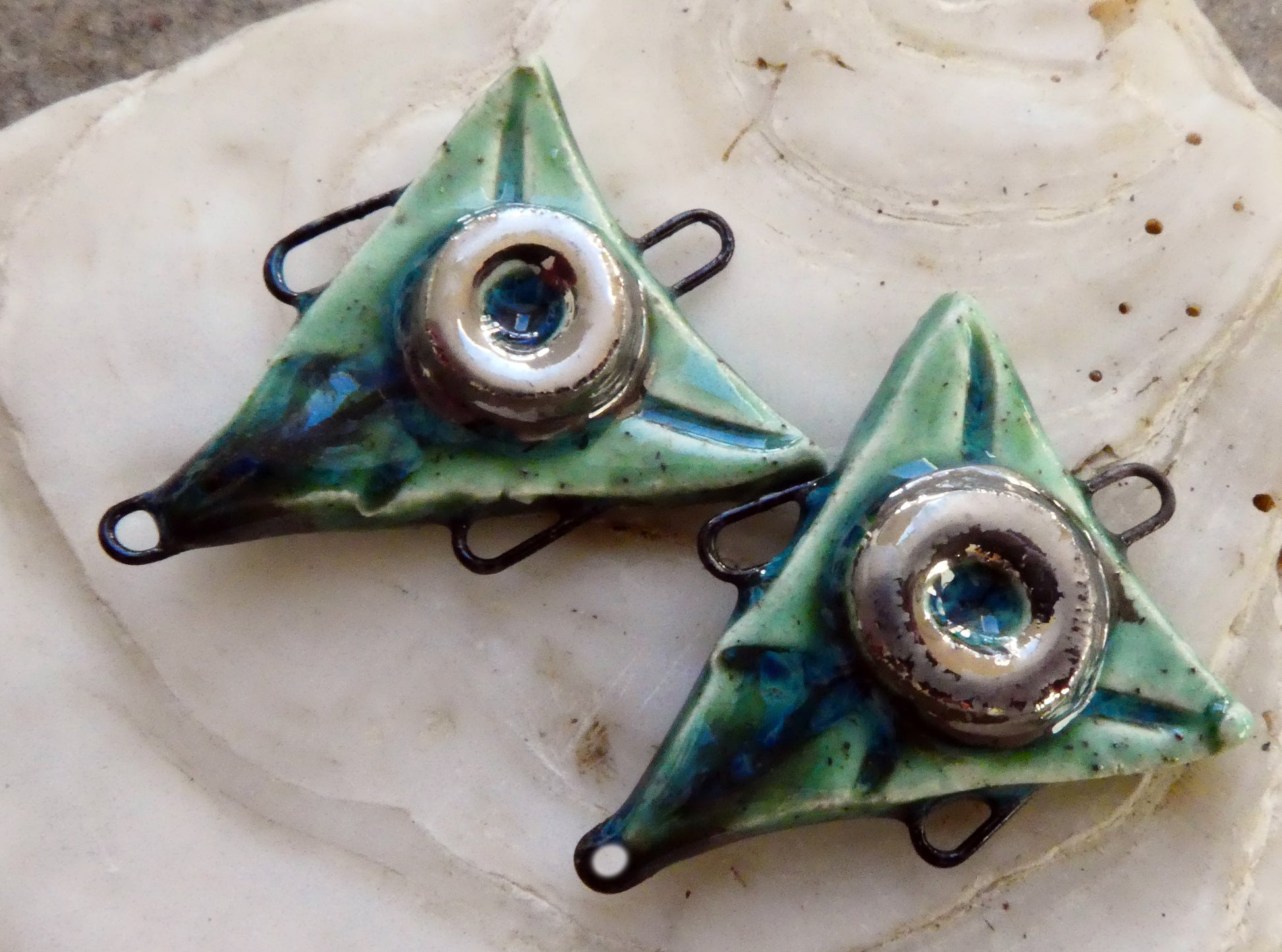 Hand formed in Earthstone and high fired. Then fired again with Gloss and Rockpool glaze. Applied with Platinum lustre, and fired once more.