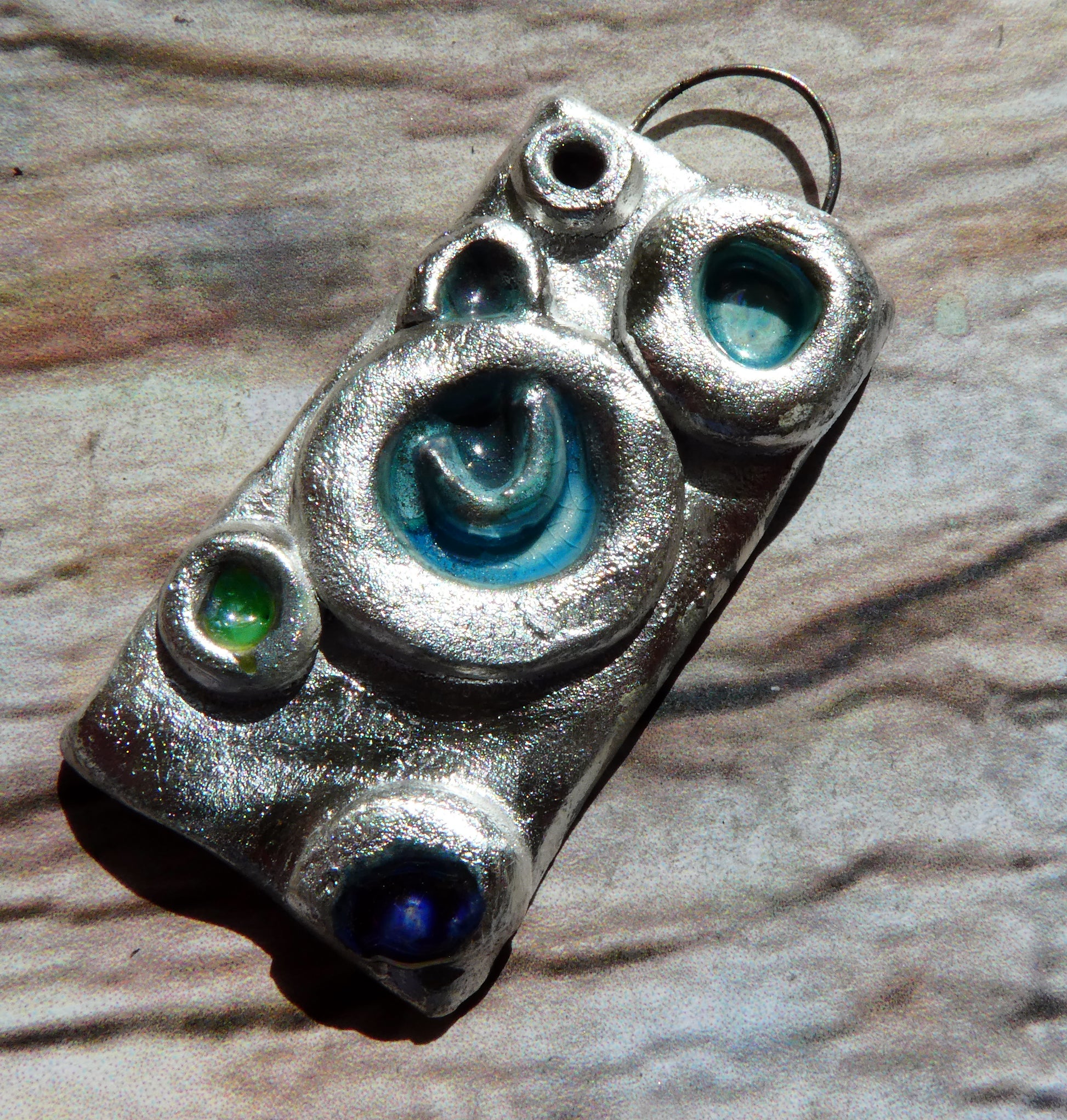 Hand formed in Earthstone and high fired. Then fired again with mixed glaze and Bronze clay. Applied with .999 Fine Silver and fired once more with Mother of Pearl Lustre.