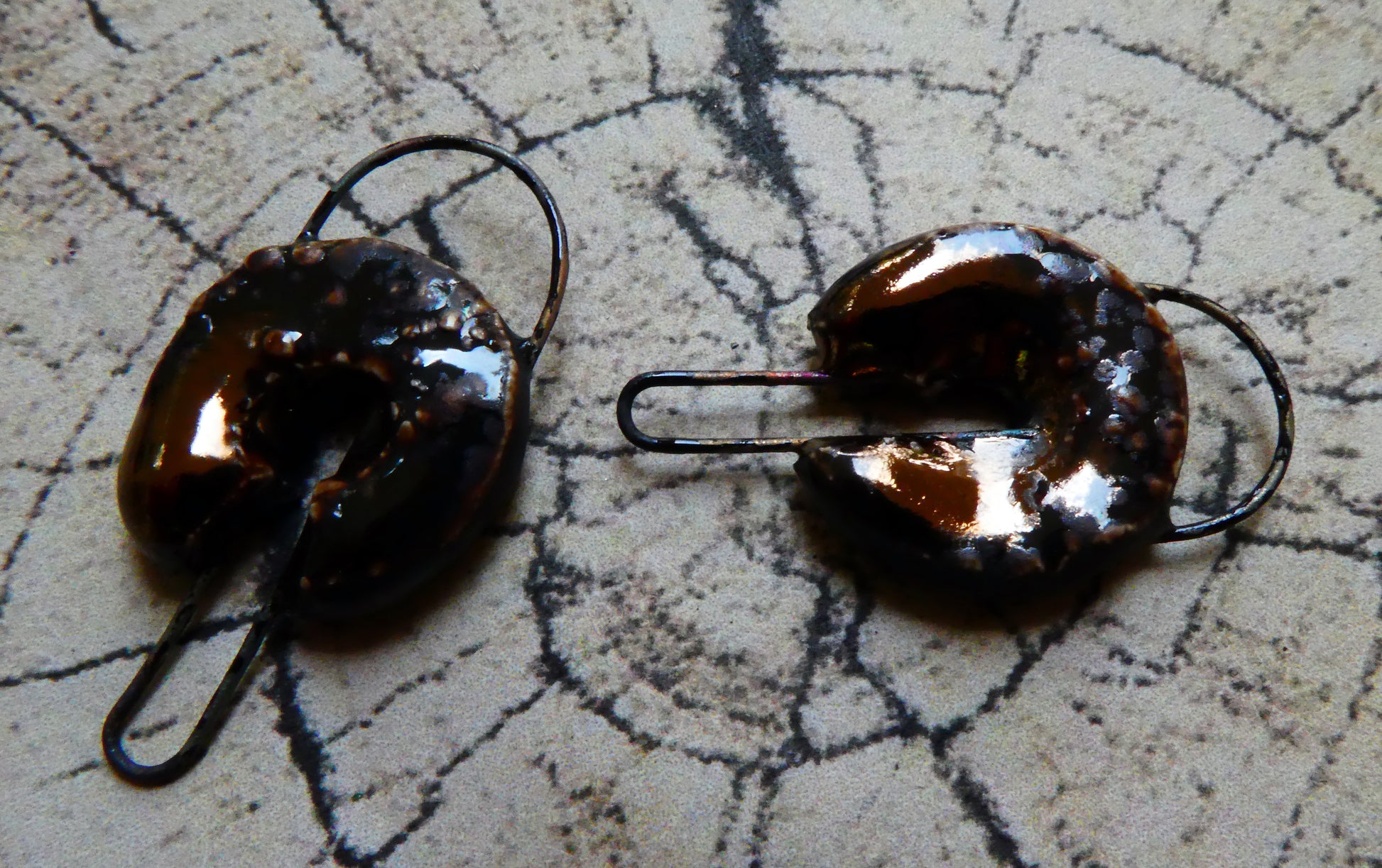 Hand formed in Earthstone, high fired. Fired again with bronze clay and Glossy Gold glaze.