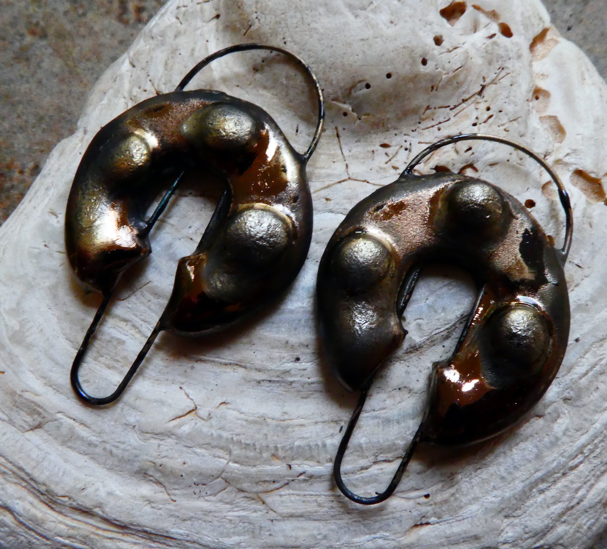 Hand formed in Earthstone, high fired. Fired again with bronze clay and Glossy Gold glaze.