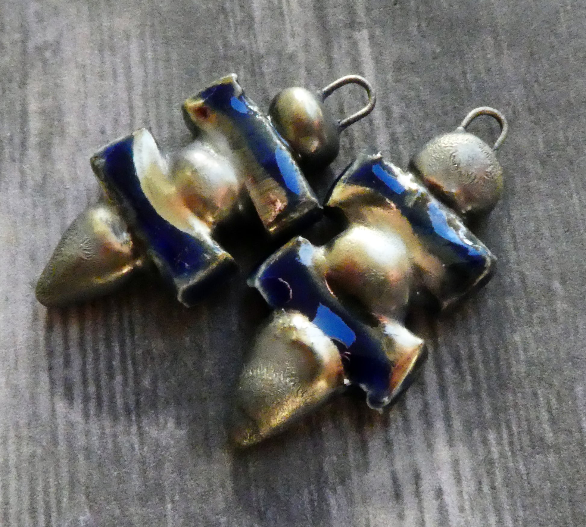 Hand formed in Earthstone, and high fired. Fired again with Mirror Blue glaze and bronze clay.